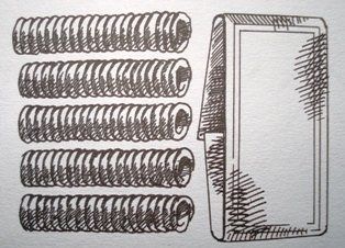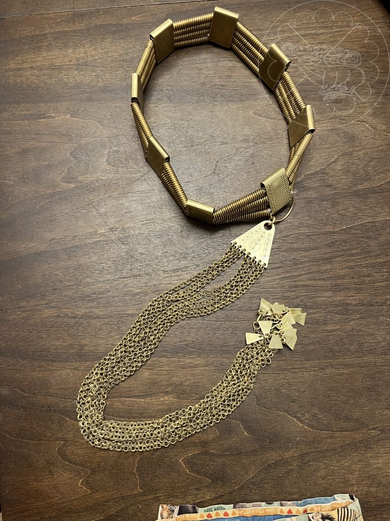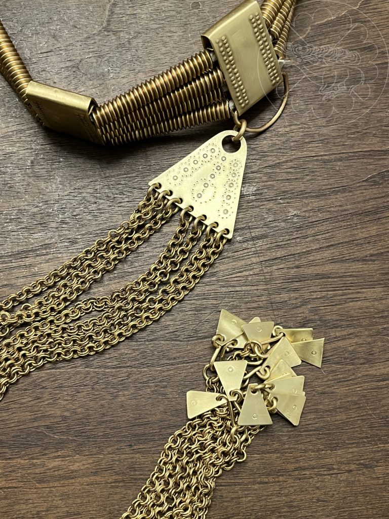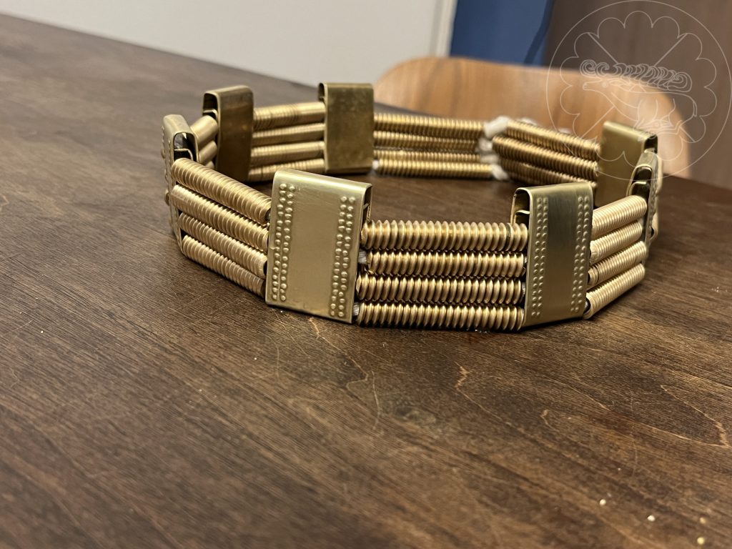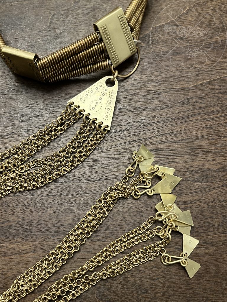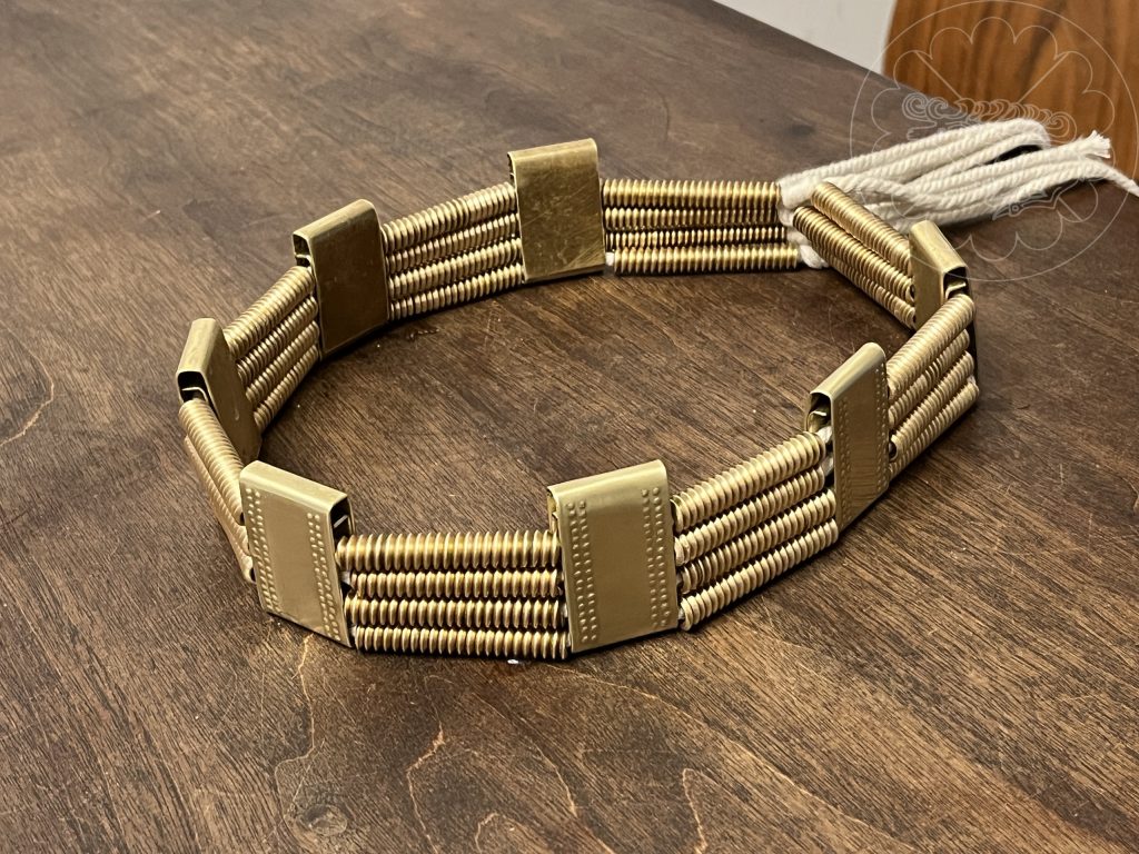 For Ingriðr’s, the spirals are made from triangle wire and the plaques are sheet brass folded with a jig to form a separate upper section to stand above the spirals. It is held together with twisted cotton rope that is knotted behind the rear central plate.