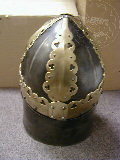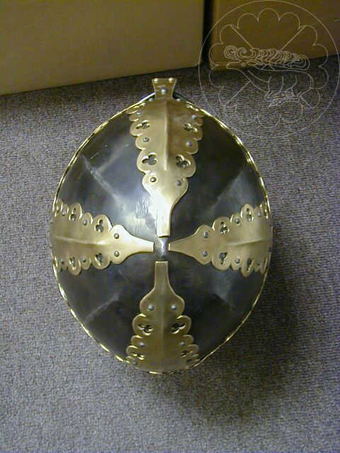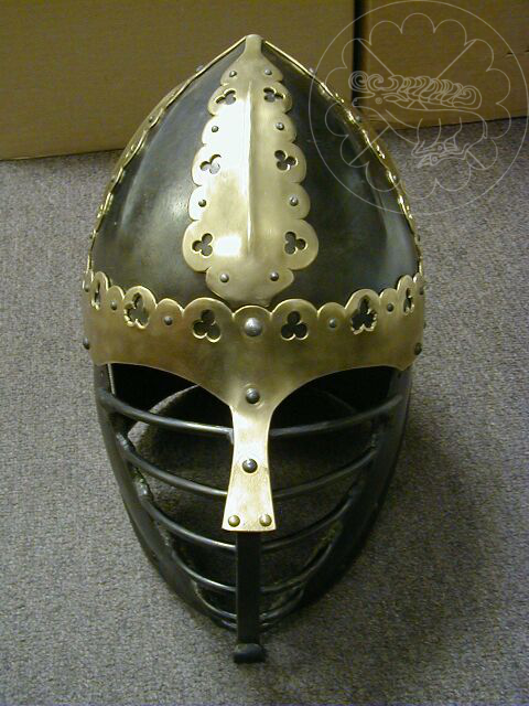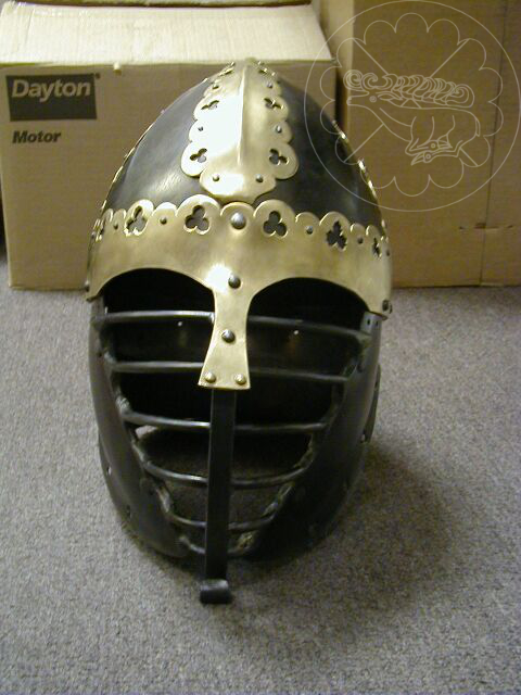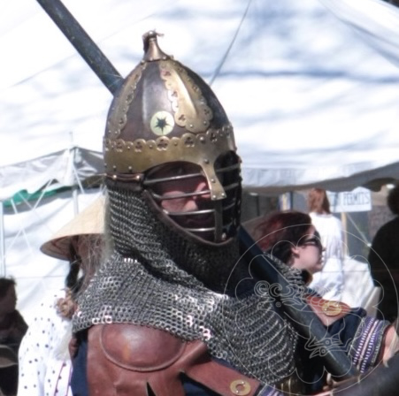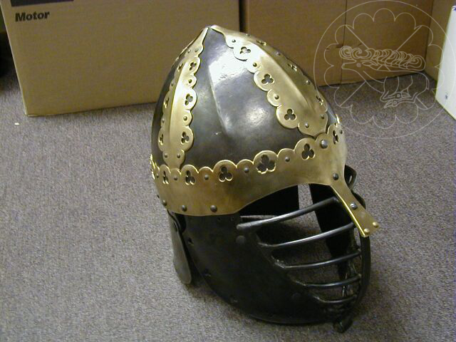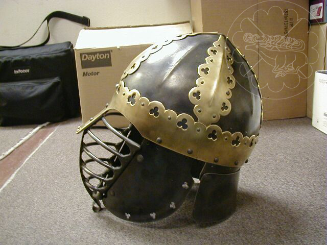 Made with Sir Richard of Wolfwood (Richard Jones) of Knotwolf Armory in 2004. Richard did all of the hard stuff (overall helm pattern, grille, welding) and I did the grunt work (cutting, shaping, riveting, piecework).