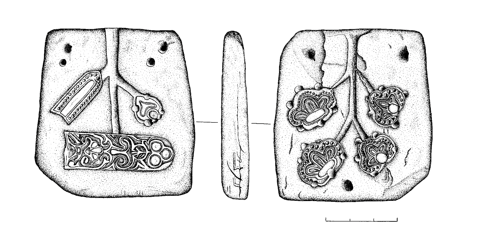 This set of belt fittings was designed not based on a find of extant fittings, but actually from a set of intact slate casting moulds found near Kyiv as described here and shown below.