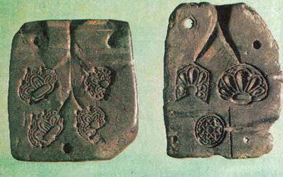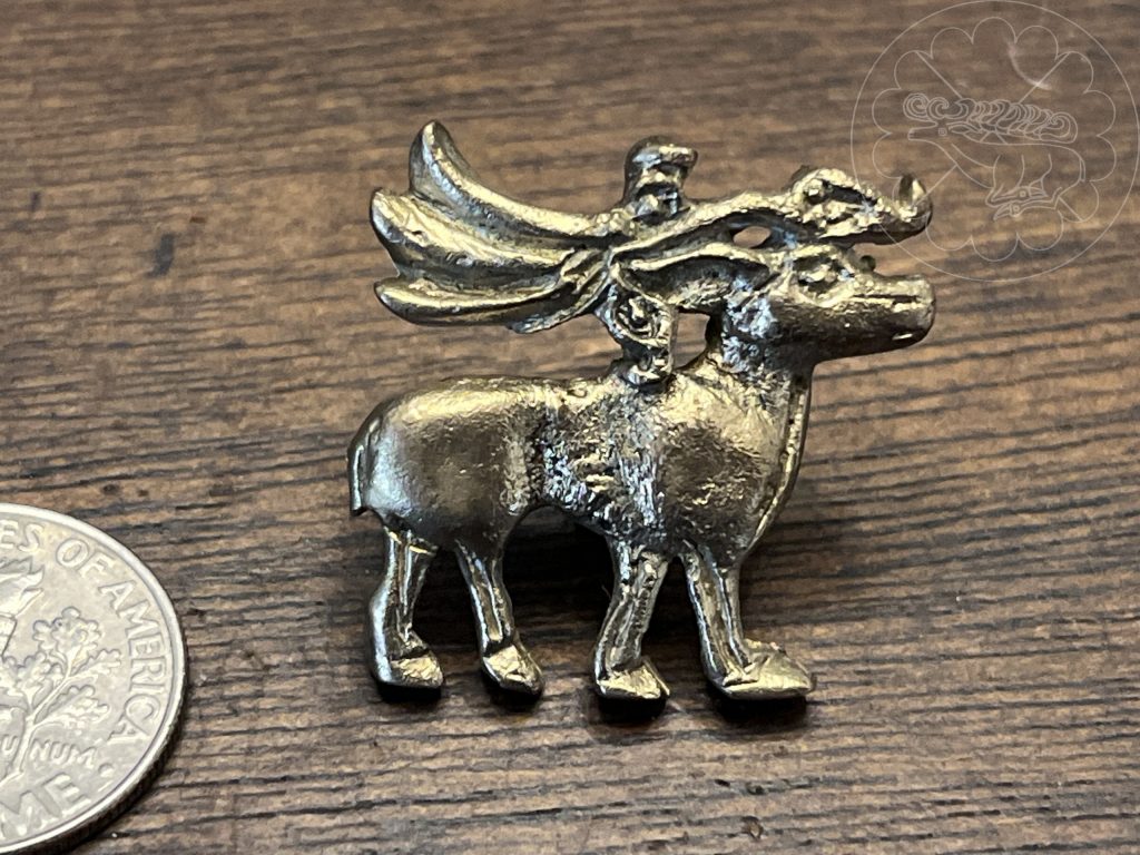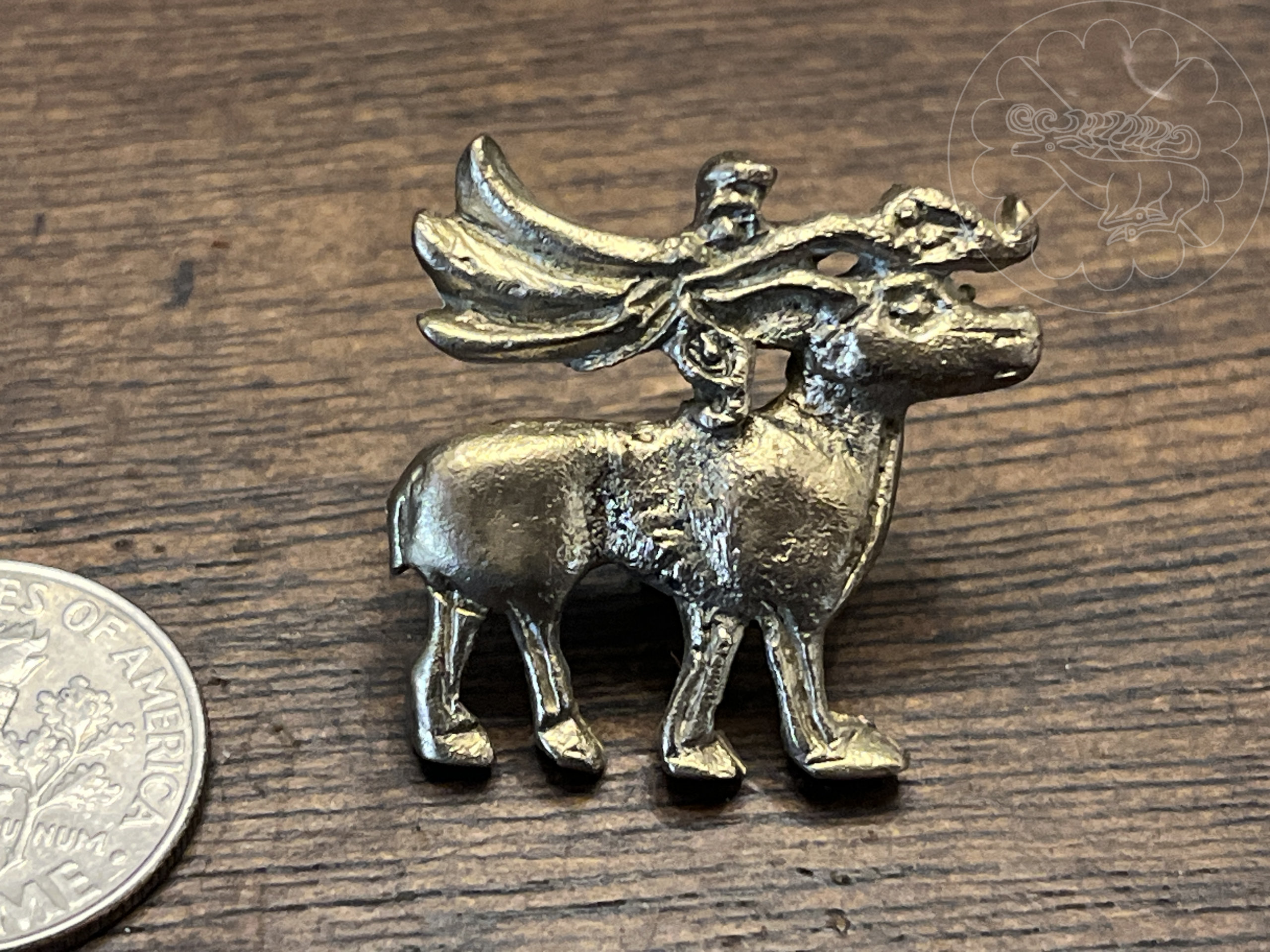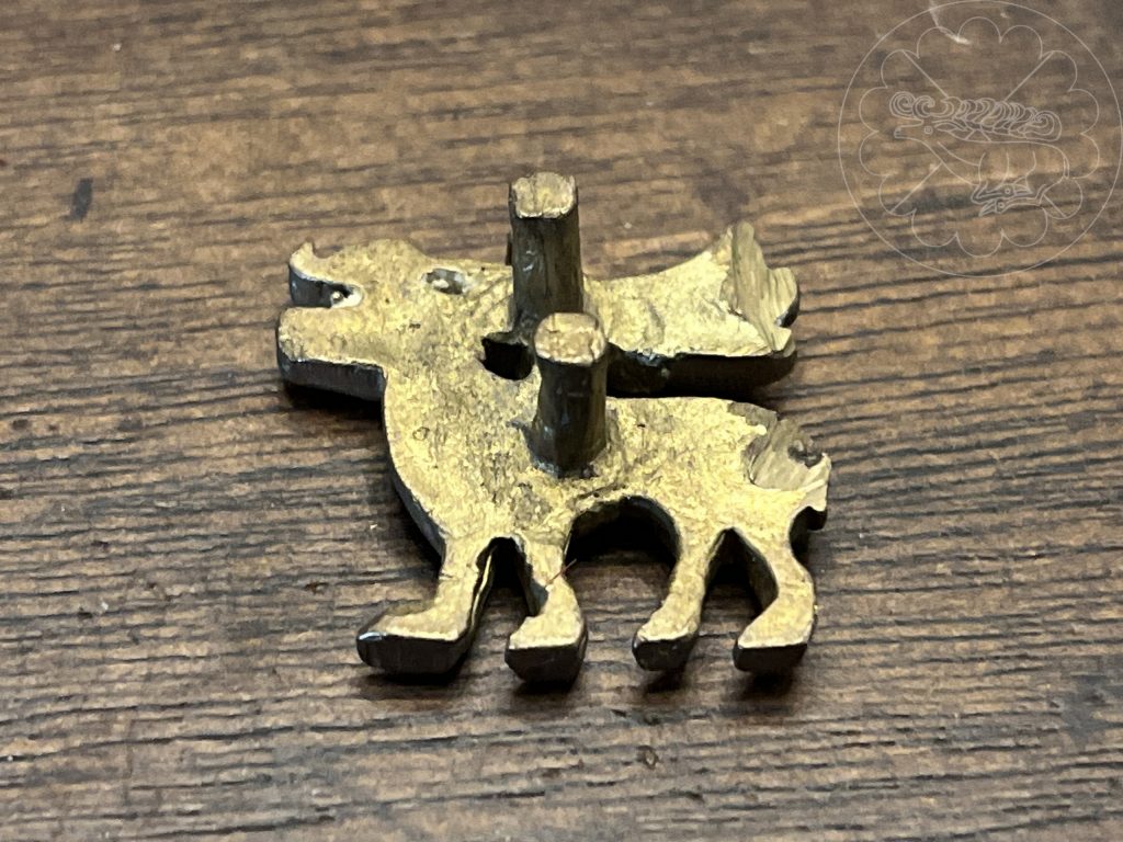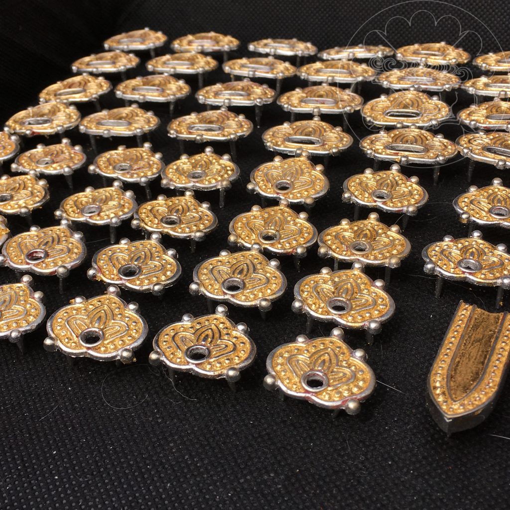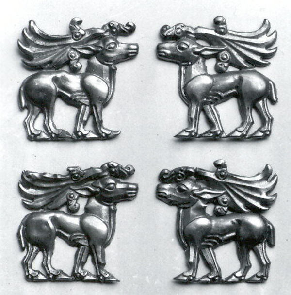 I made the original waxes for these in college in 1992 I believe & sized to match the originals (although recently I’ve learned that the originals thinner). They have studs protruding at the back that can be peened to rivet them. I’ve used them to decorate a stave coat (body armor), my County coronet, the back of my helmet, and a pair of them in silver were soldered together and form my link on the Outlands baby knight’s chain.