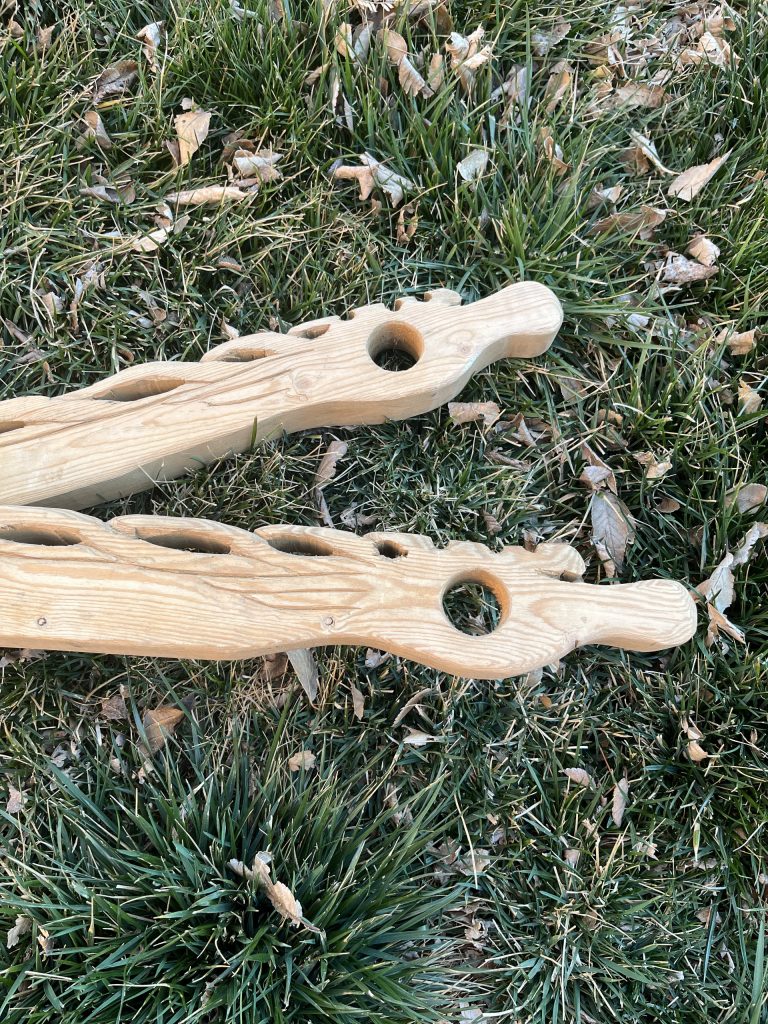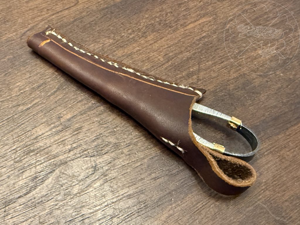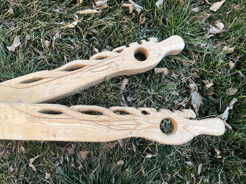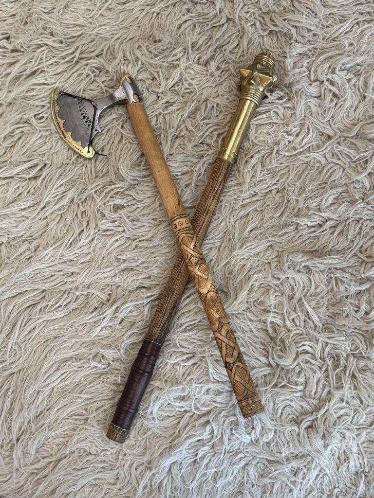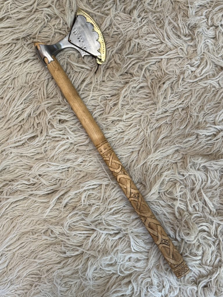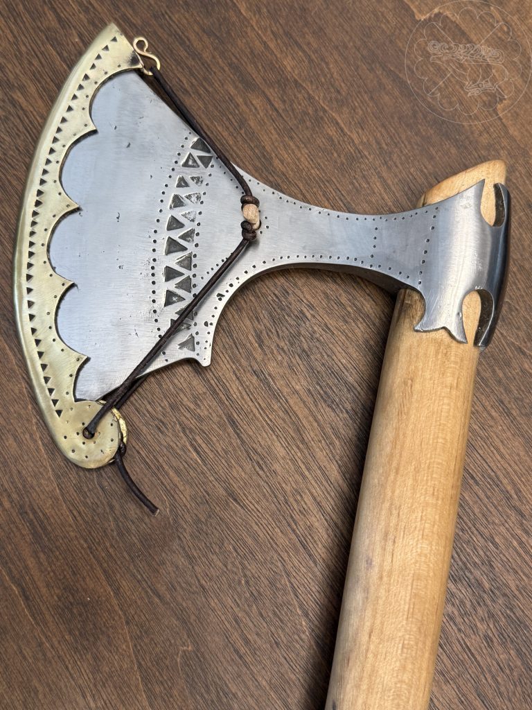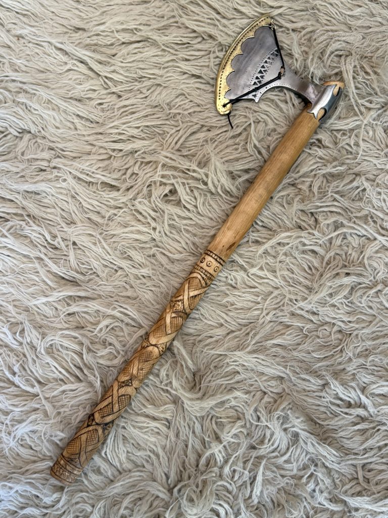 The axehead is based on an axe found in Novgorod that I purchased from True History Shop. The haft is maple with carved accents inspired by another axe find from Novgorod. The blade cover is made from brass and lined with wool to protect the edge. Though not common, a small number of metal axe sheaths have been documented in the viking age.