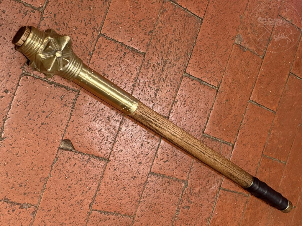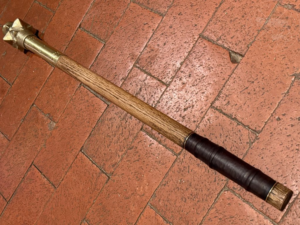 I purchased a mace head from Ukraine, cleaned it up, and mounted it on an oak haft with a brass reinforcement and leather handle.