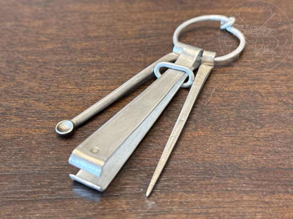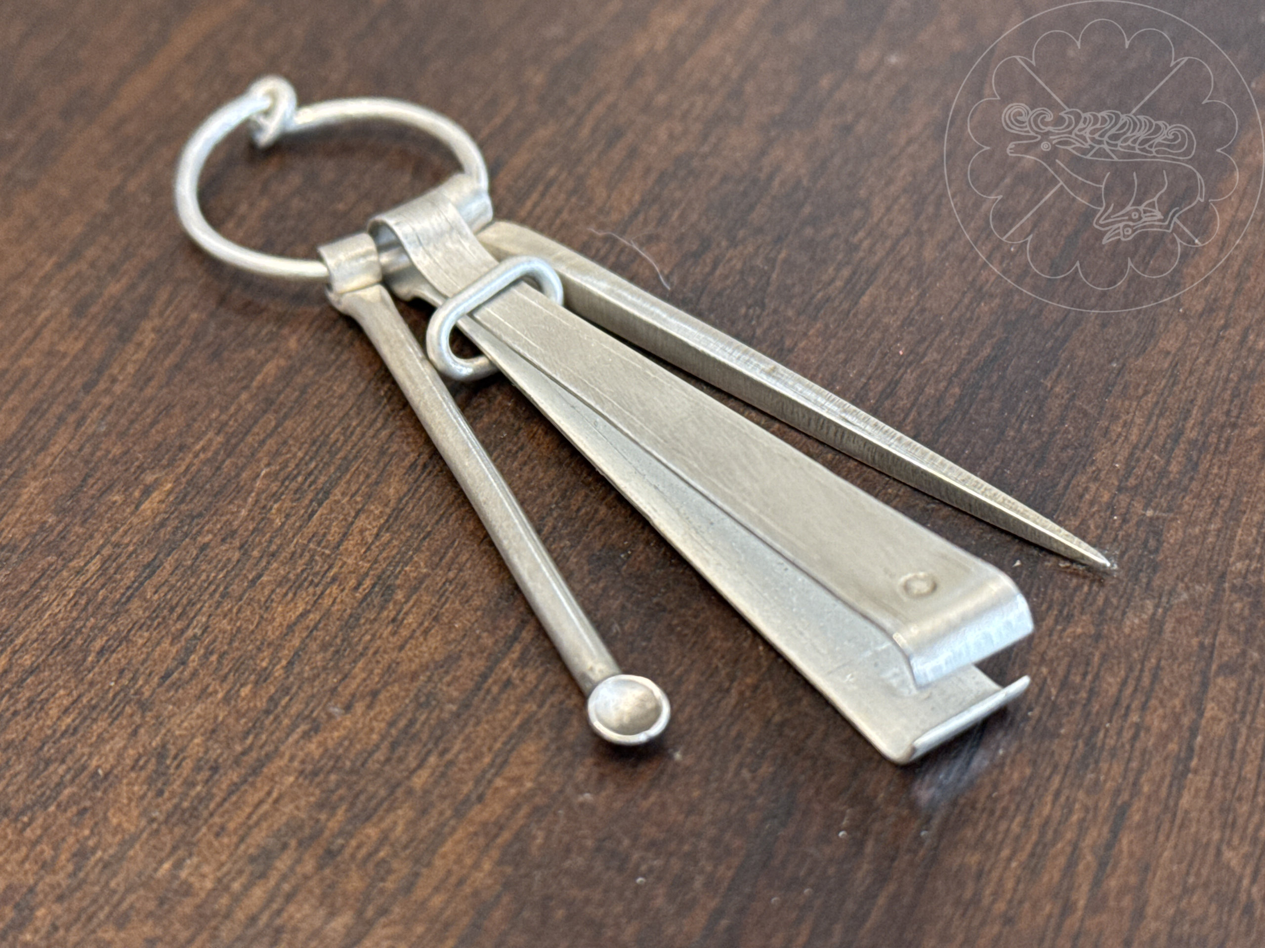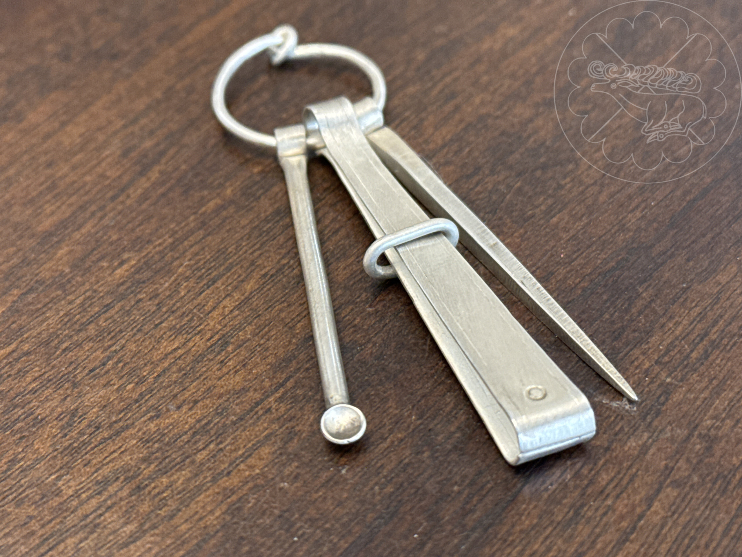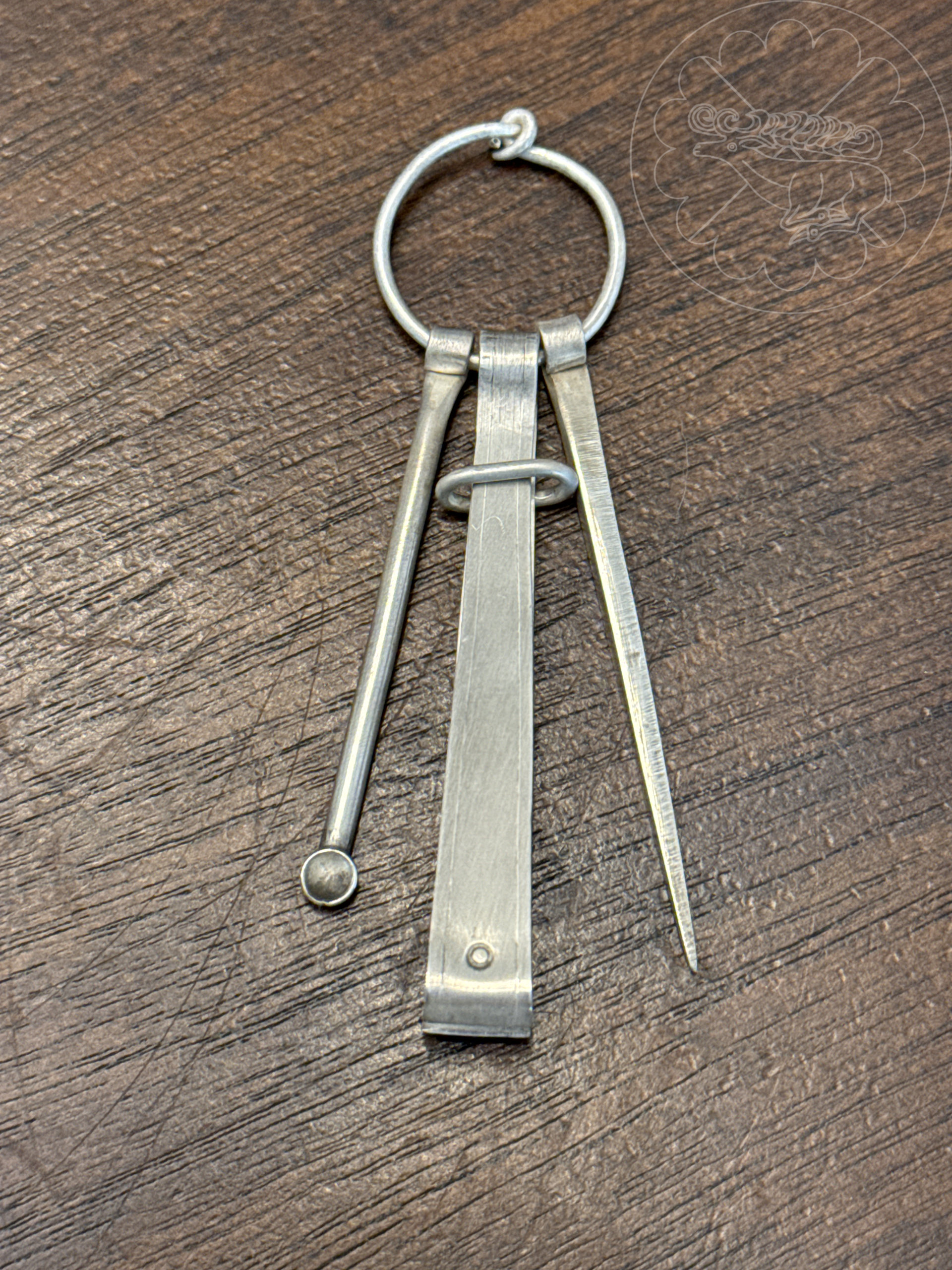 I made a simple sterling silver chatelaine to add to my kit with an awl, an ear spoon, and tweezers.