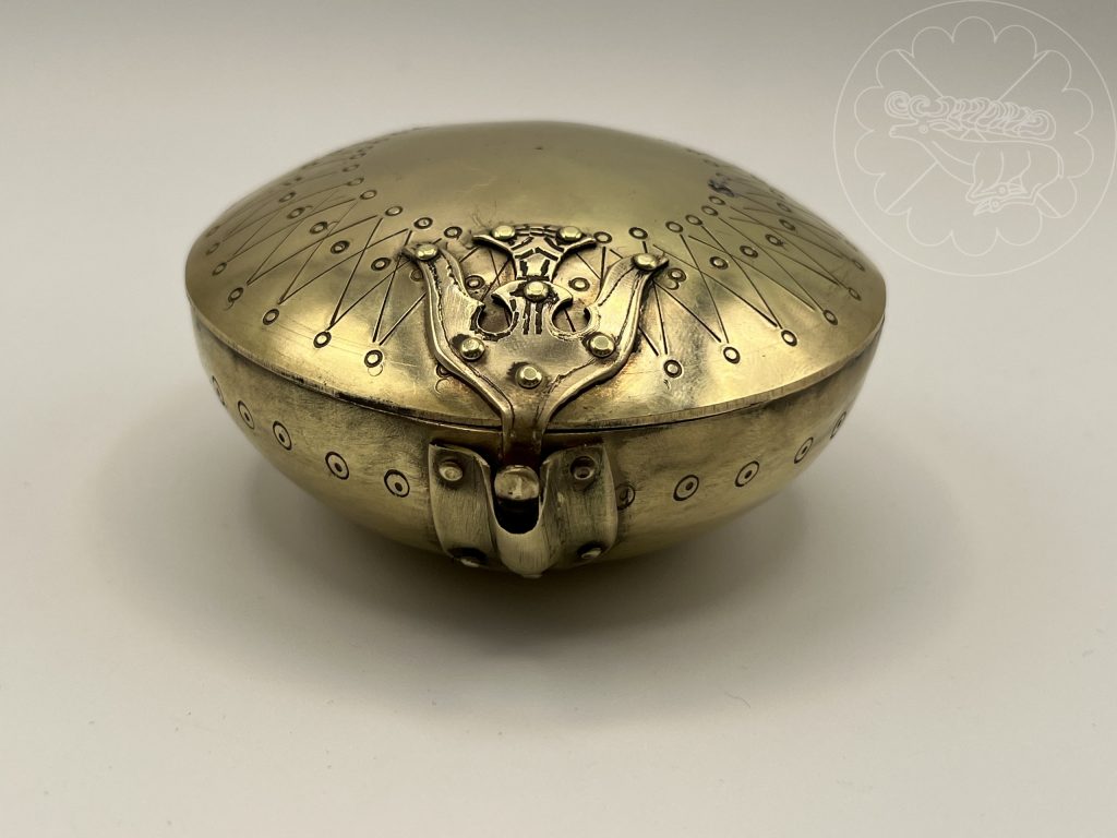 Another tarsoly – the original consists of a lightly graved silver plate that is highly worn from years of use. The graving, even on the best preserved bottom section of the plate, is not very deep compared to other examples. The background is stippled with an array of very small circles. Also, the entire surface