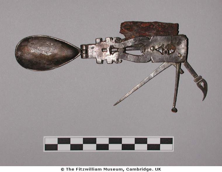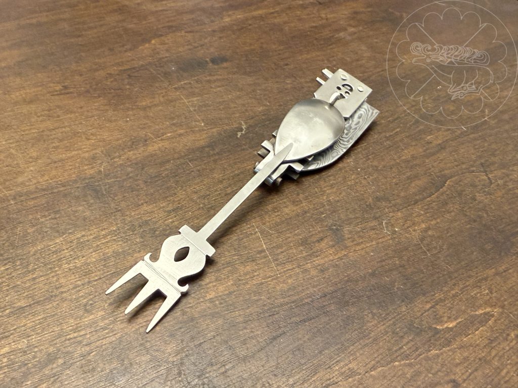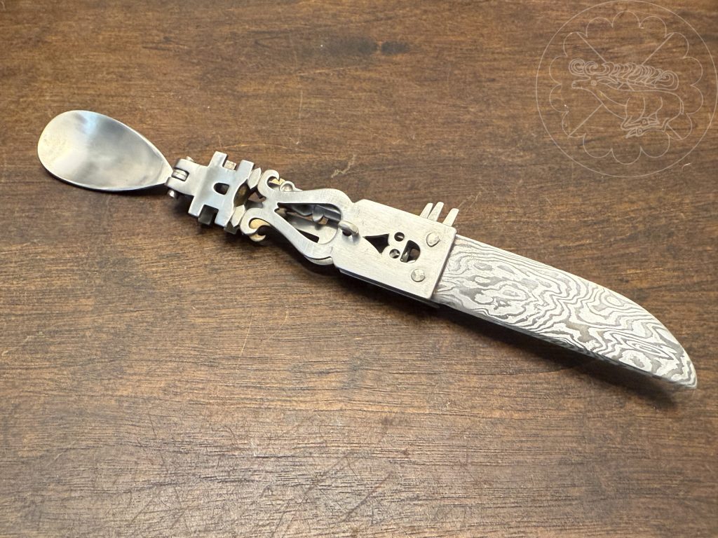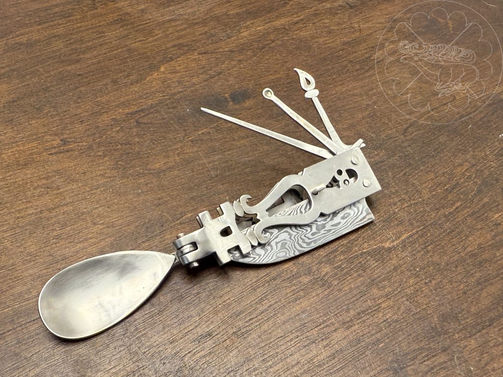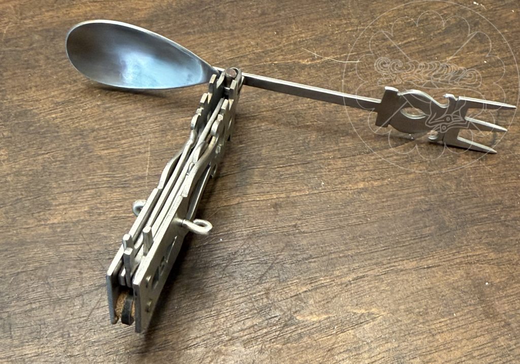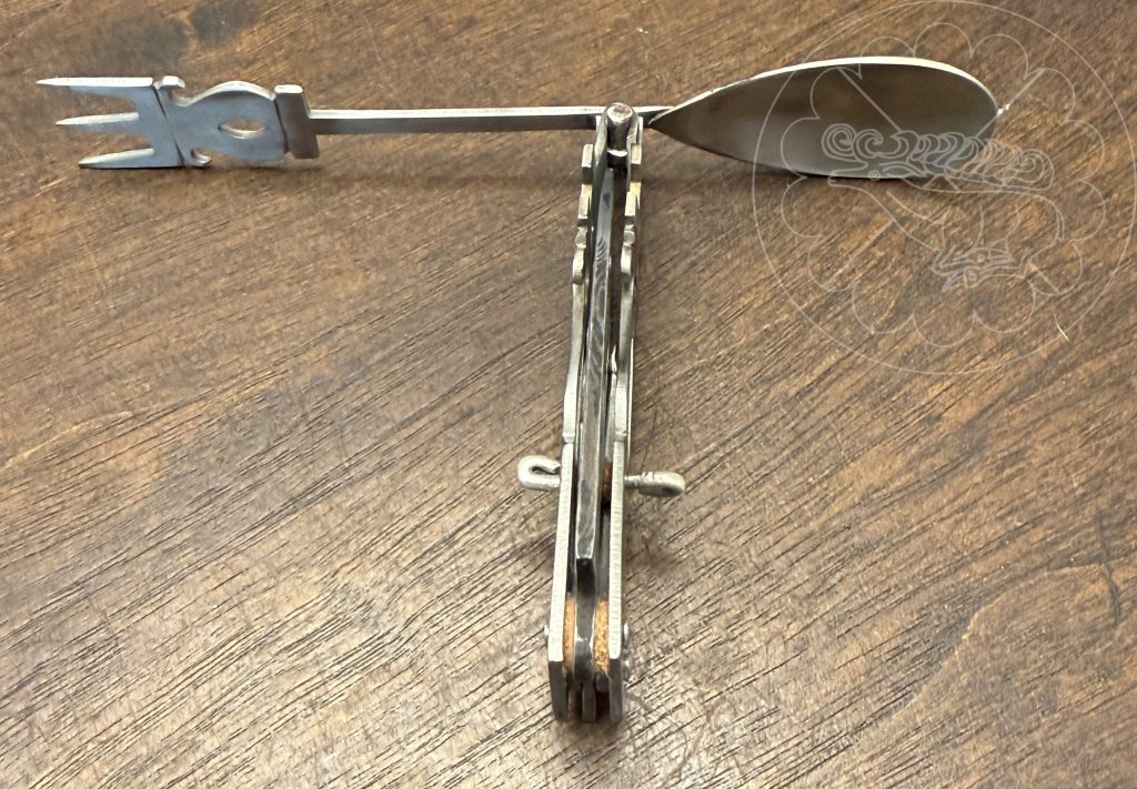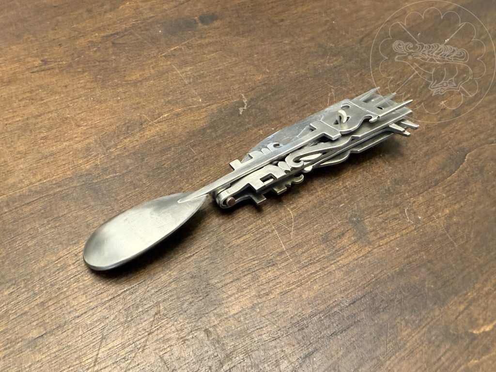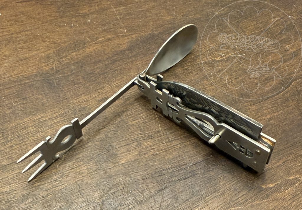The original piece is built from silver with an iron blade, and due to its materials of construction is speculated to have been a status item, rather than a more common tool. It contains an opposing fork and spook which rotate on a pivot and appear to have a mechanism to lock the folded portion of either in place for use. Additionally it contains a folding knife blade, and 3 other tools; a pick or awl, what may be an ear spoon, and a flame shaped tool of unknown function (if the others are personal hygiene tools, this may have been for cleaning under fingernails).