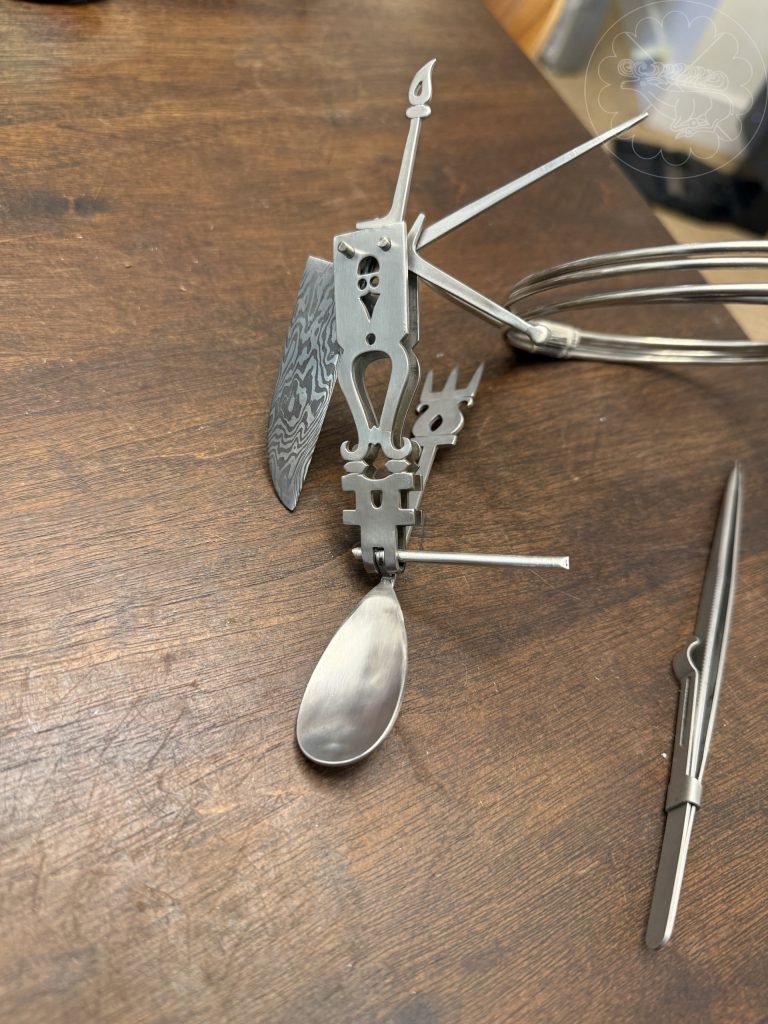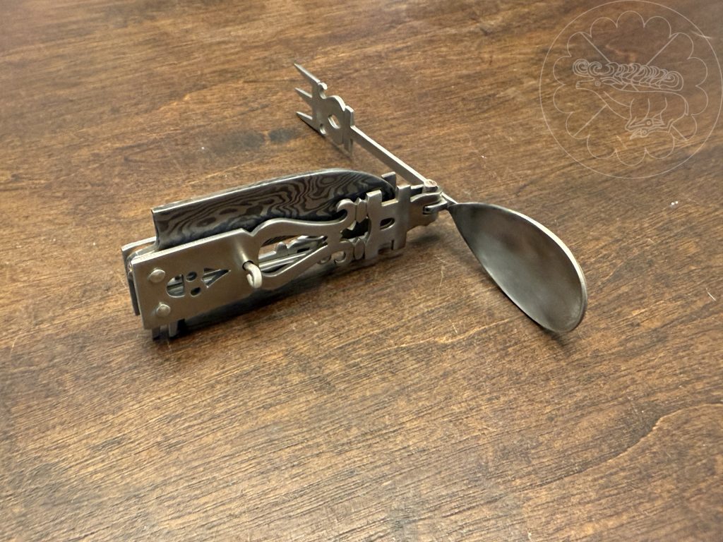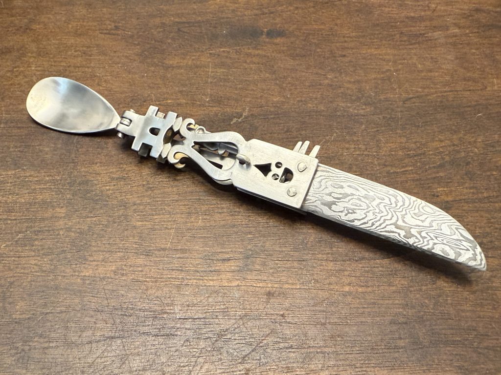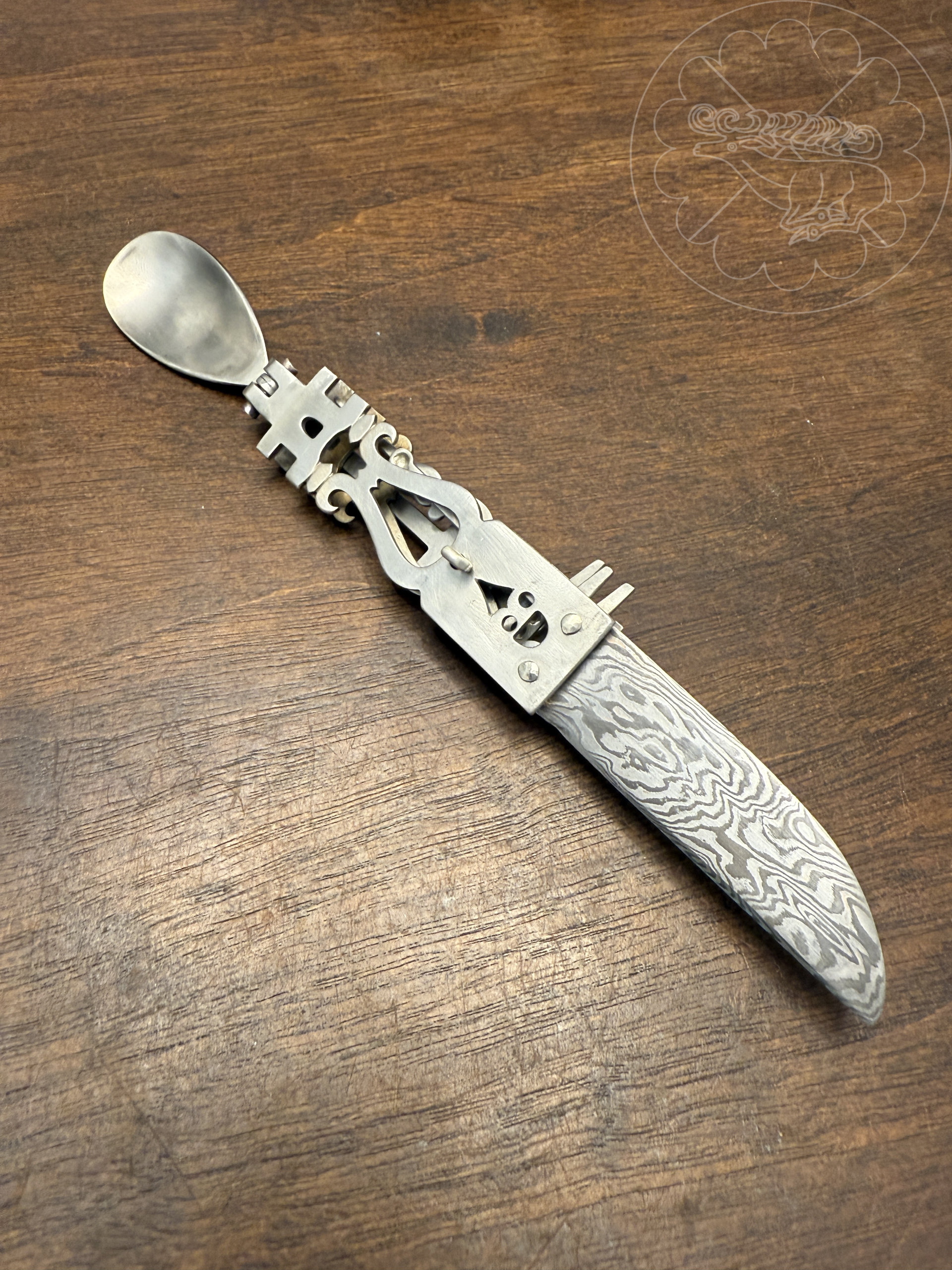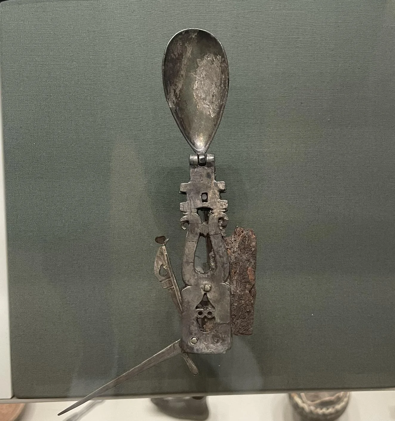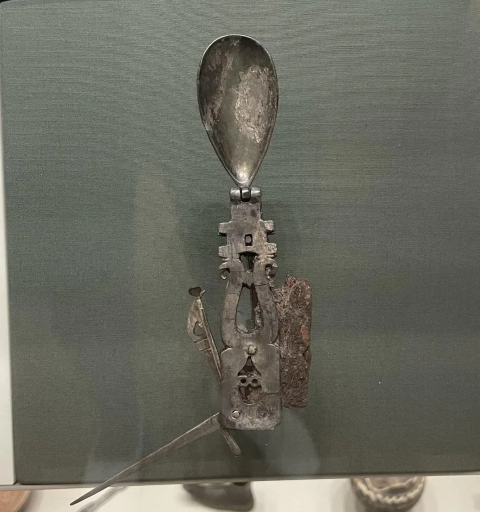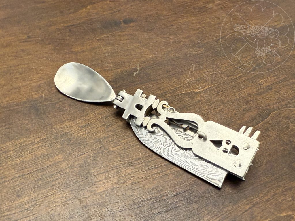 The original piece is built from silver with an iron blade, and due to its materials of construction is speculated to have been a status item, rather than a more common tool. It contains an opposing fork and spook which rotate on a pivot and appear to have a mechanism to lock the folded portion of either in place for use. Additionally it contains a folding knife blade, and 3 other tools; a pick or awl, what may be an ear spoon, and a flame shaped tool of unknown function (if the others are personal hygiene tools, this may have been for cleaning under fingernails).