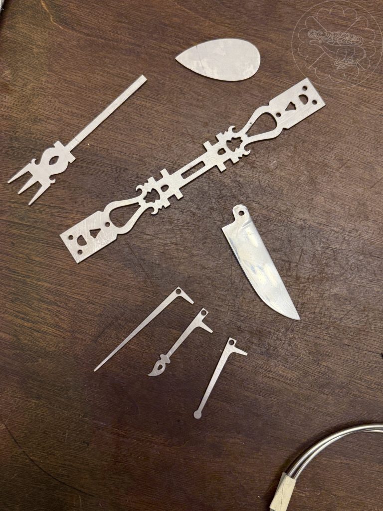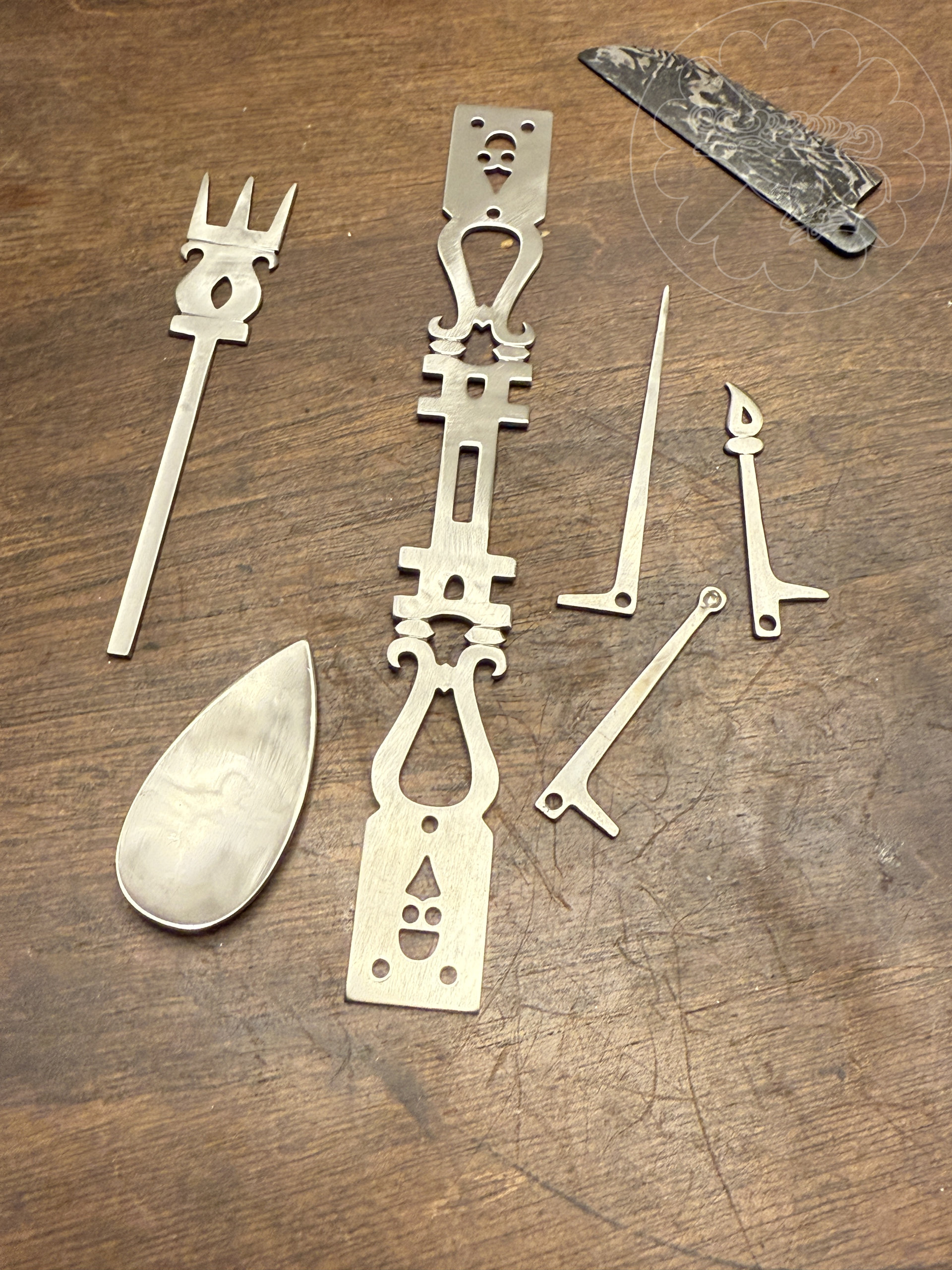 I decided to make a reproduction as a gift to a friend, Count Zachariah de Kane. I had originally thought that I had a large sheet of 14 gauge nickel silver that I planned to use for the project, but after cutting and beginning to form and solder the pieces, it became apparent that it was NOT nickel silver, but actually stainless steel. This posed some additional challenges for the fabrication, but at the end of the day, it ended well with a durable and unique piece that looks good and functions well. Here are the cut pieces before and after forming.