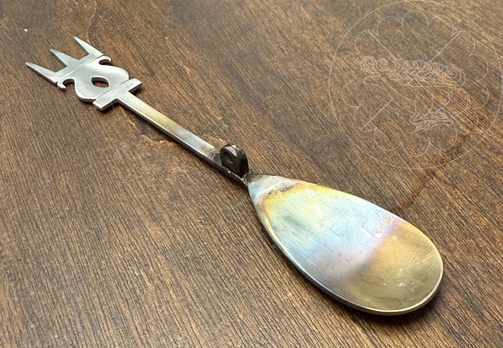 After forming, the fork/spoon was soldered together and a bump was added for the hinge. The length of this piece centered on the hinge is such that the locking pin will pass through the eye in the fork to lock it in place, or right over the very end of the spoon when flipped..