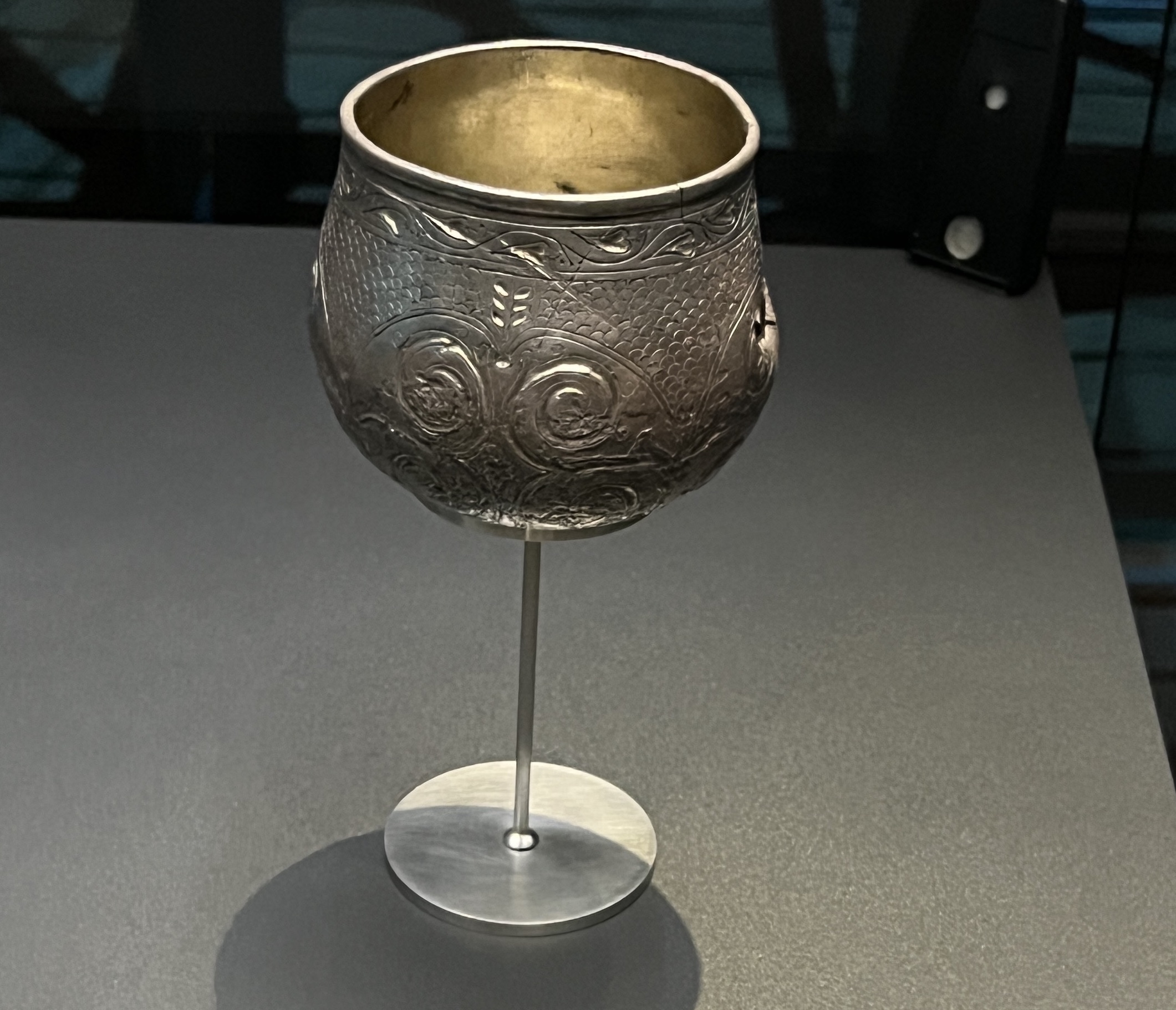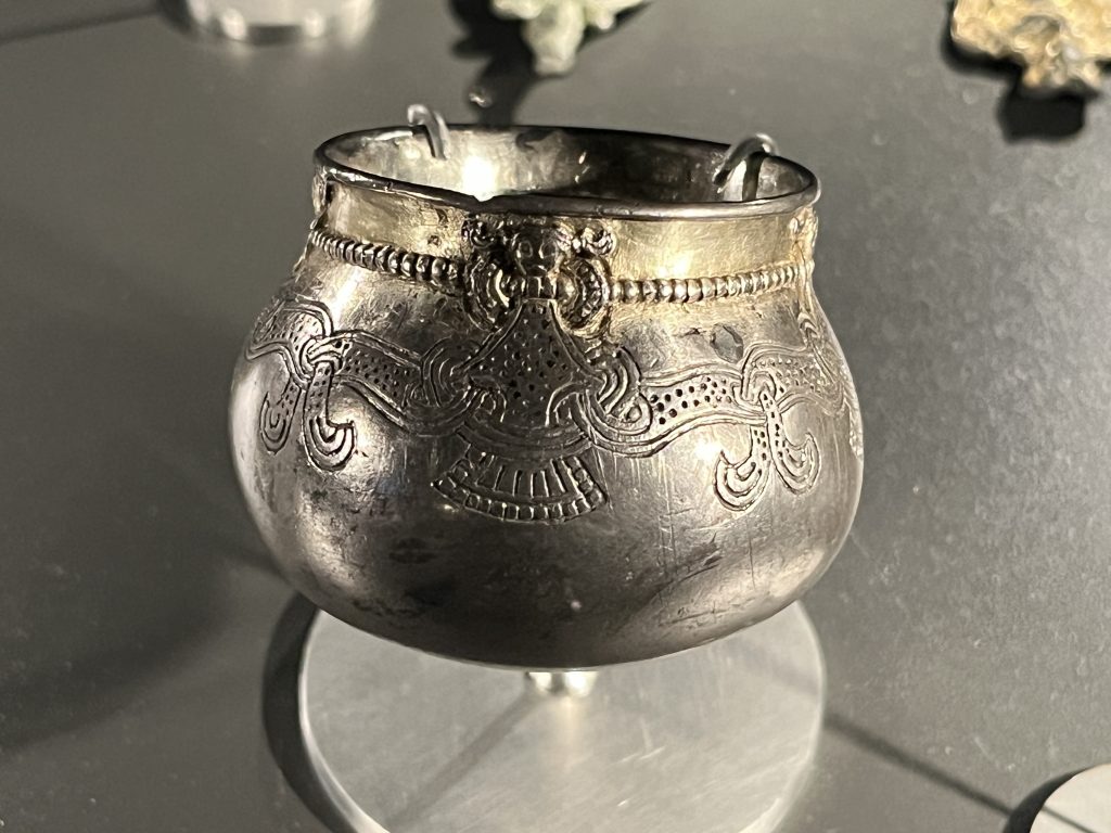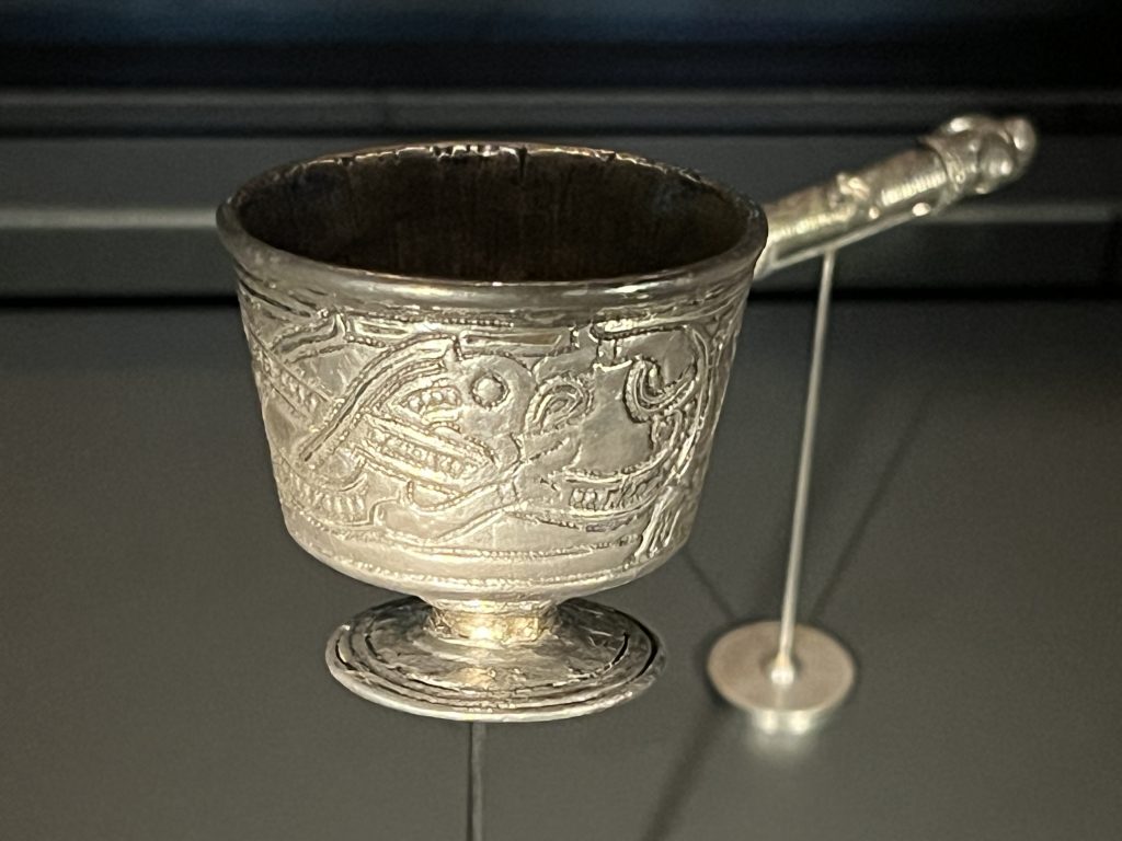 One of the most famous viking age silver cups is a round bottomed cup from the Lejre hoard with cast details and gilding near the rim. I’ve seen several reproductions of this cup, and the original is shown in the photo below.