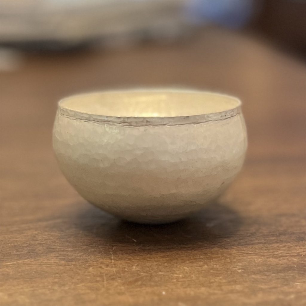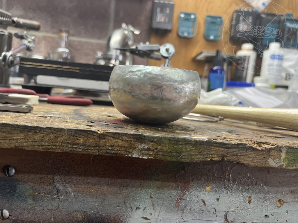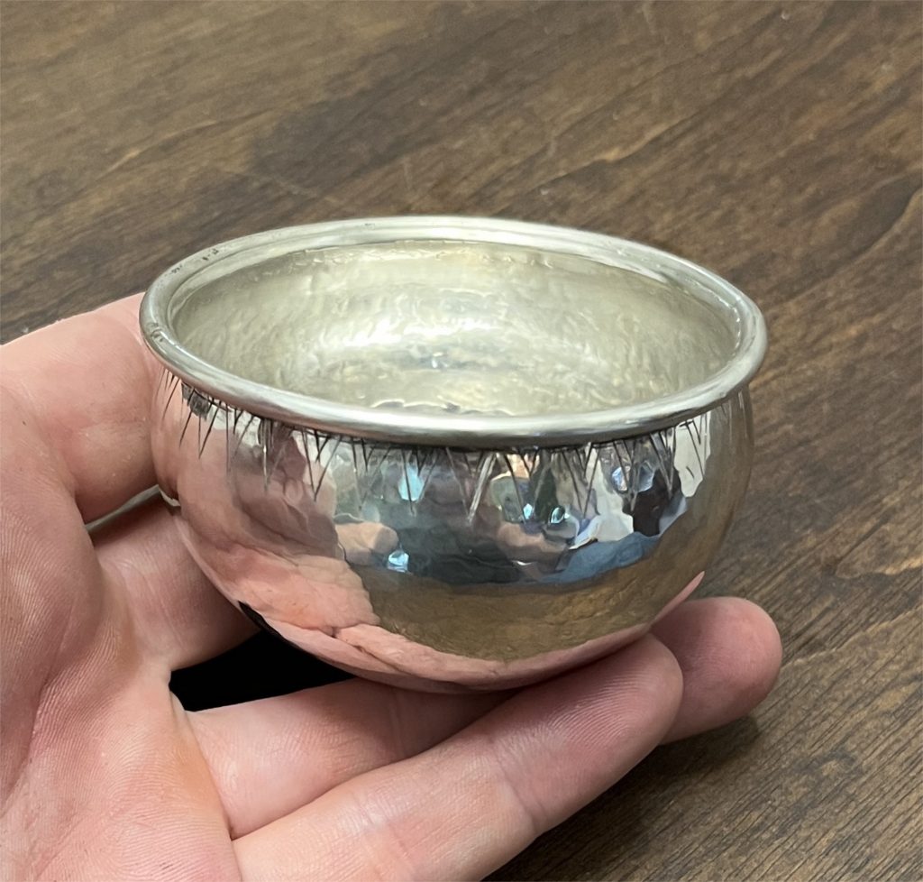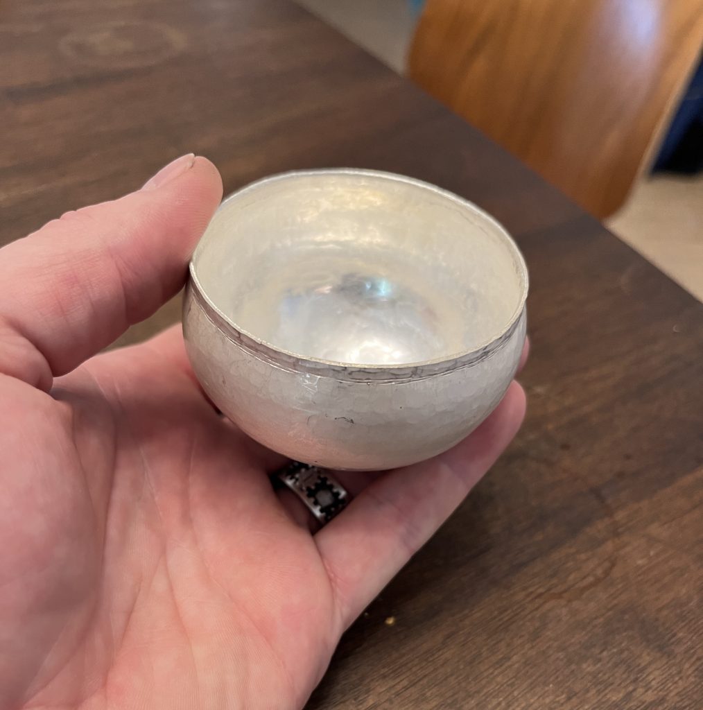 Back to the drawing board. I realized that the size of the 1st try was a little large, so the final cup was raised from a 4” round cut from 18 gauge sterling silver. I concentrated on continuing to move the metal around the base of the cup throughout the process and not focusing the flame into the center of the bowl. The finished cup measures a little over 3” in diameter. The detail on lip was done with a hand graver.