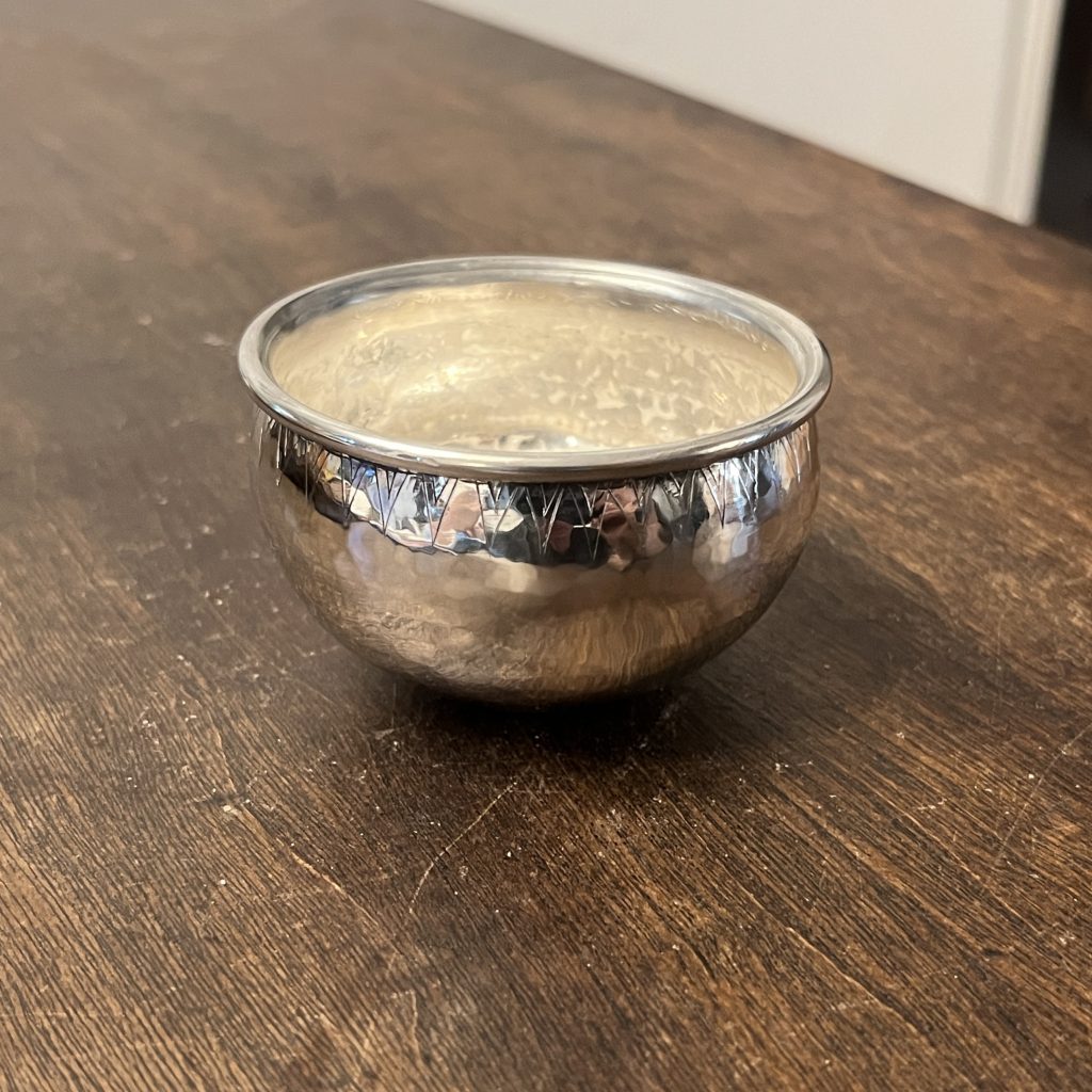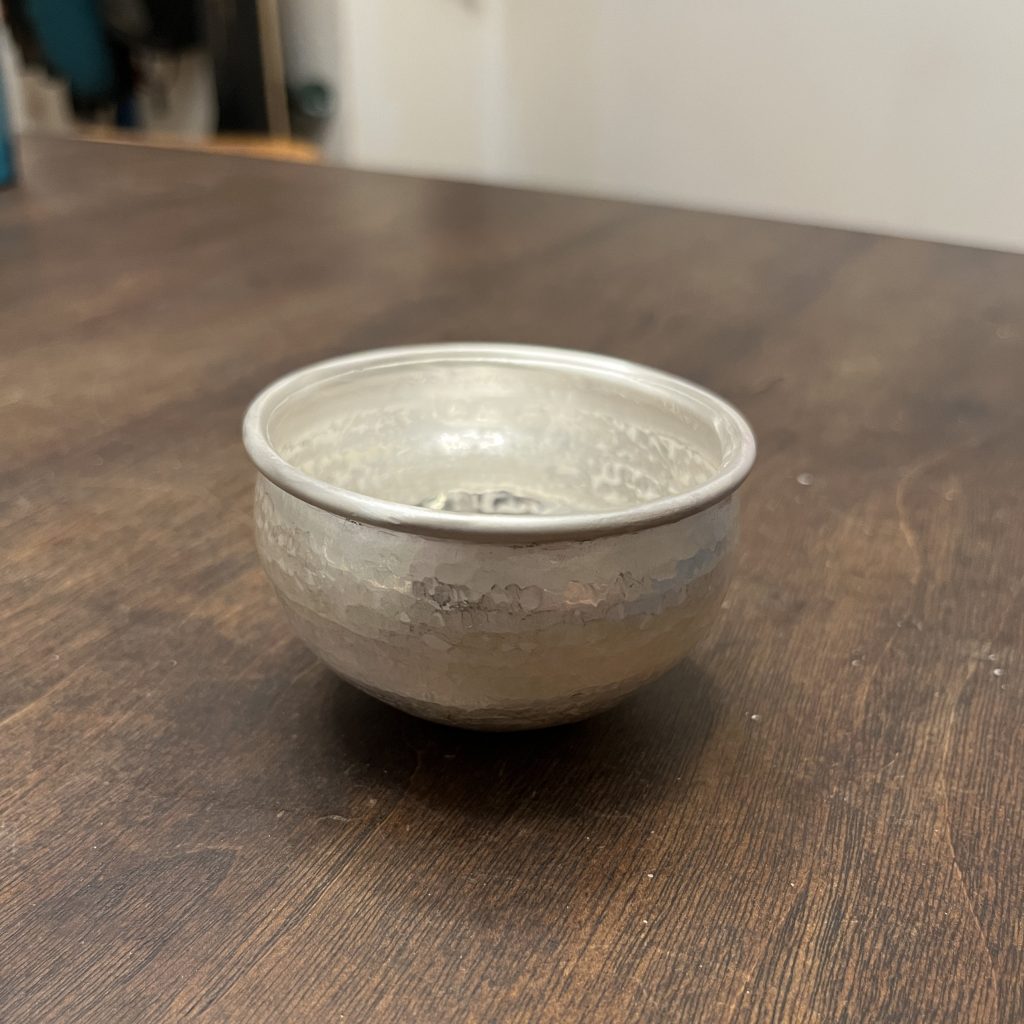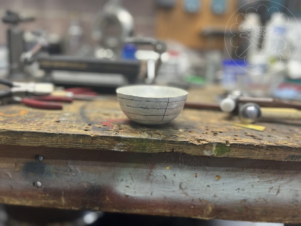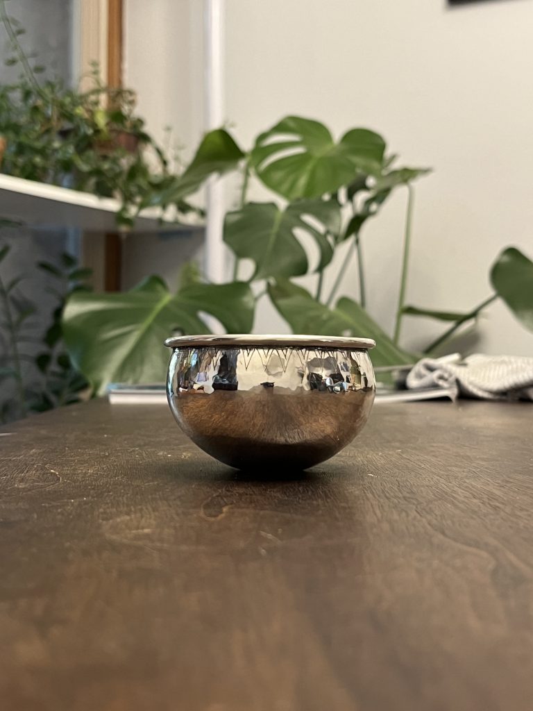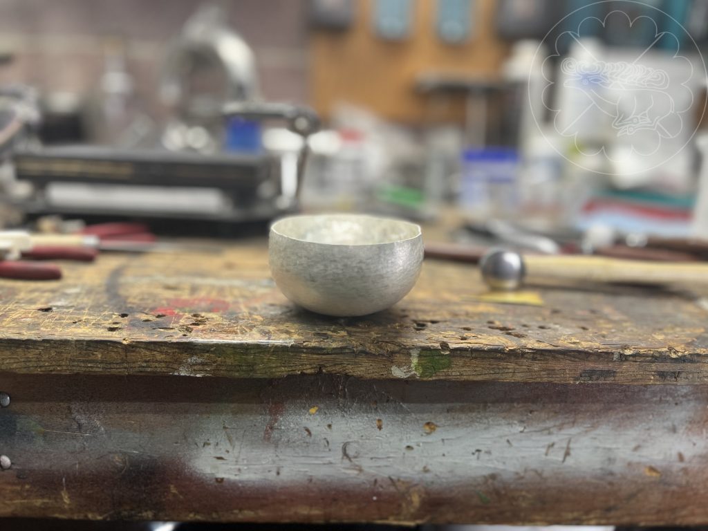 Back to the drawing board. I realized that the size of the 1st try was a little large, so the final cup was raised from a 4” round cut from 18 gauge sterling silver. I concentrated on continuing to move the metal around the base of the cup throughout the process and not focusing the flame into the center of the bowl. The finished cup measures a little over 3” in diameter. The detail on lip was done with a hand graver.