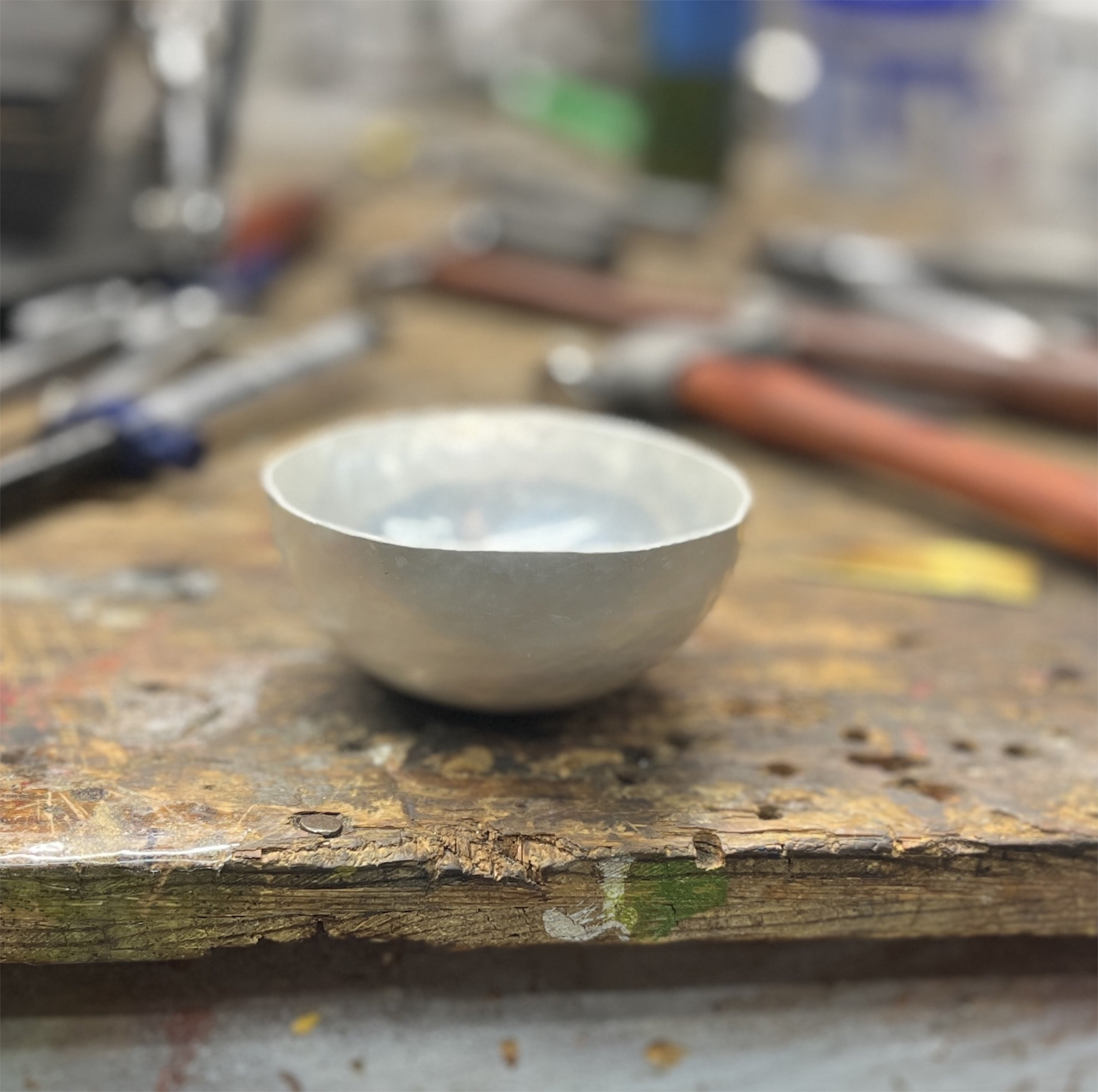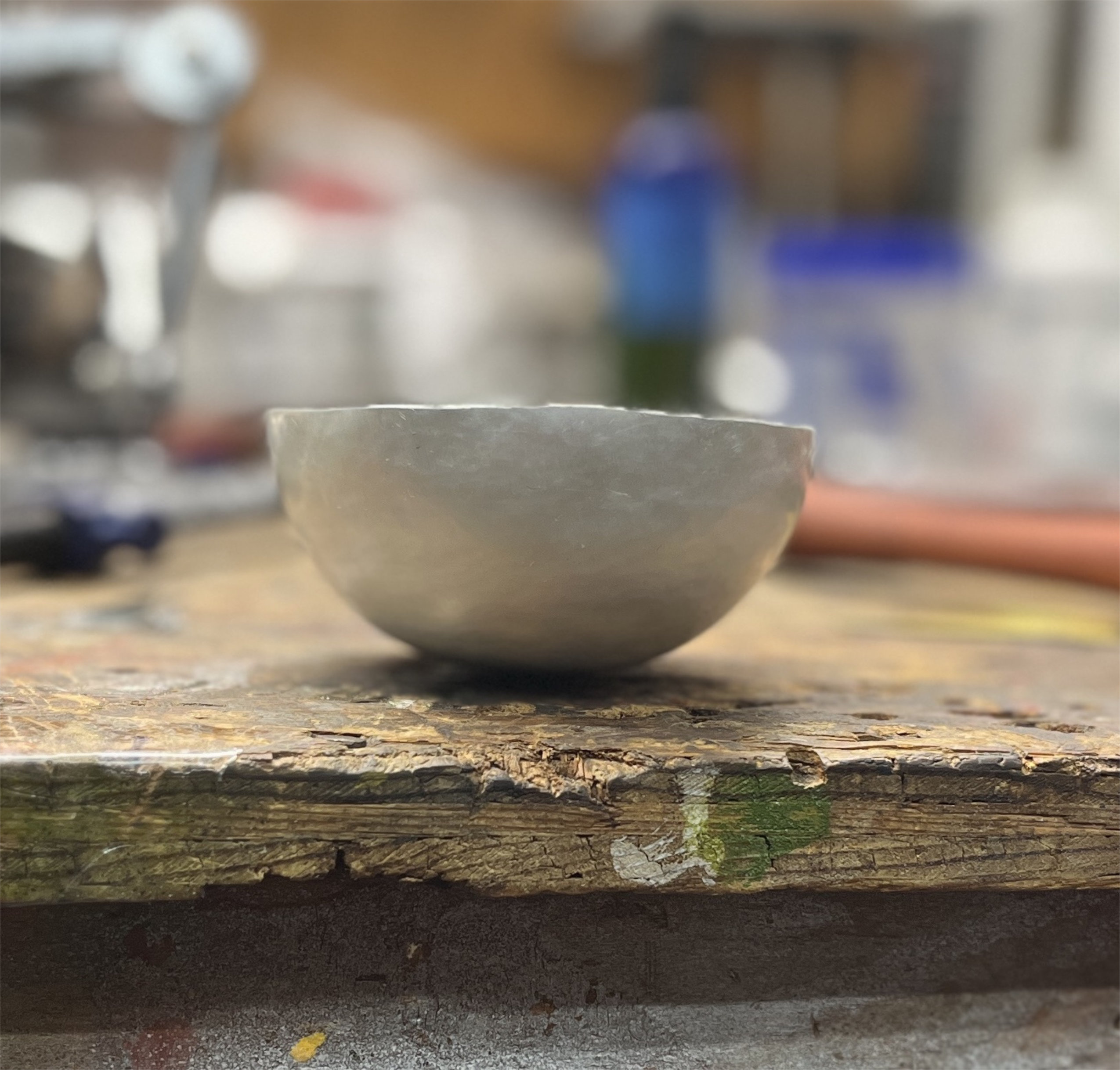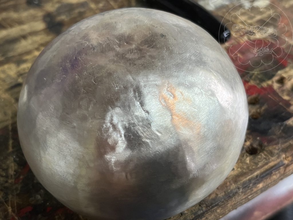 My first attempt used a 4.5” round of 18 gauge Argentium silver. Unfortunately, cracking developed in the base of the cup late in the process. This cracking was not due to over-work, but rather to over-annealing of this area without continuing to work the base as I shaped the lip. The grain structure of the silver grew from the repeated annealing and ultimately, several small cracks appeared when the shape had been mostly completed.