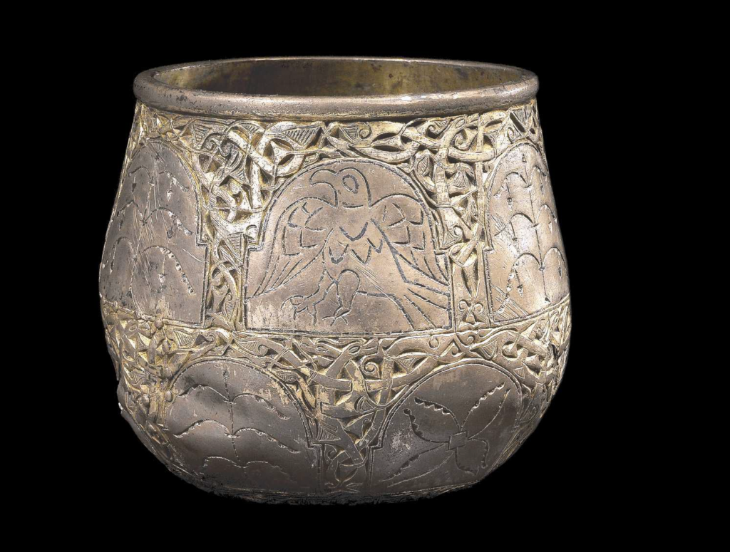 Another famous silver cup, known as the Jelling Cup or Gorm’s Cup, has an entirely different shape/design than the other round cups found.