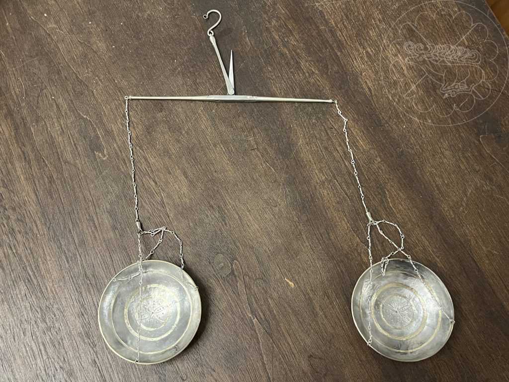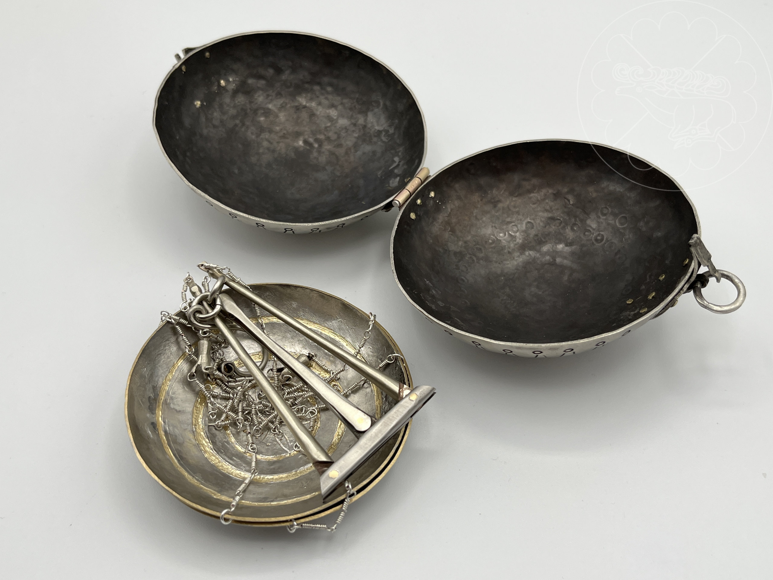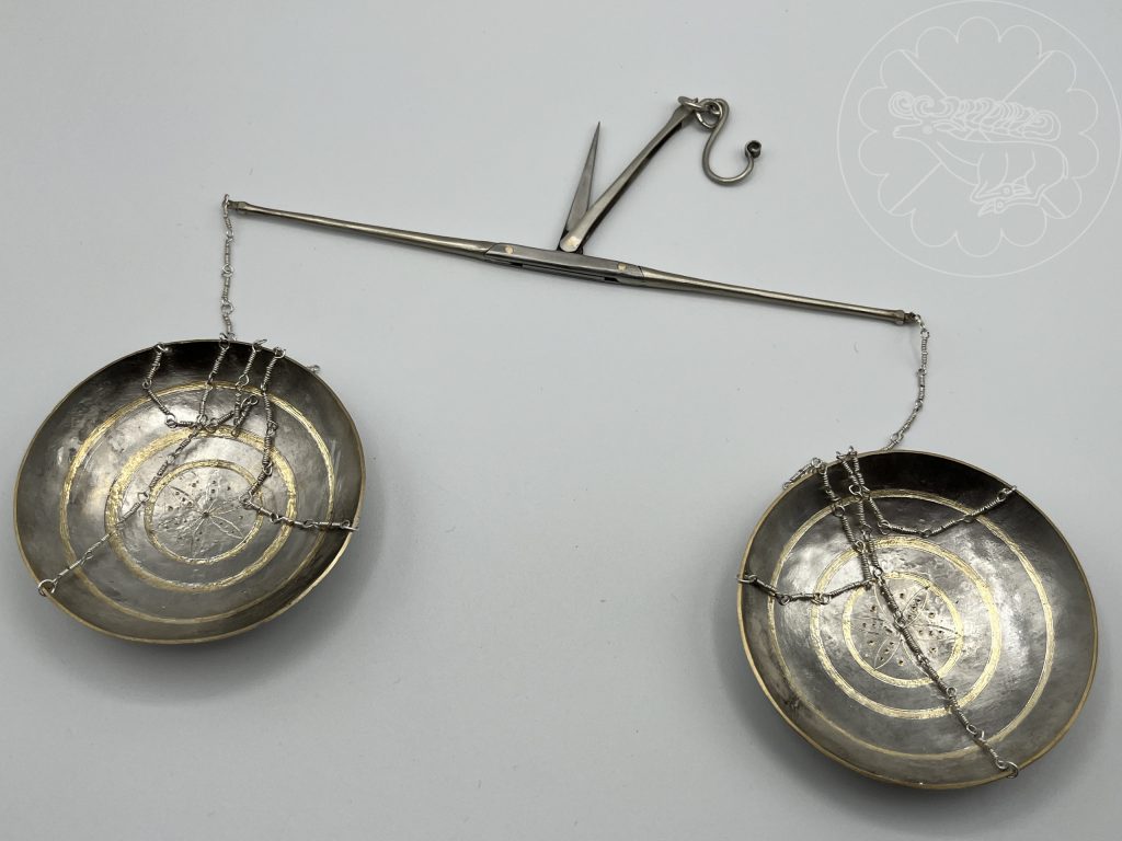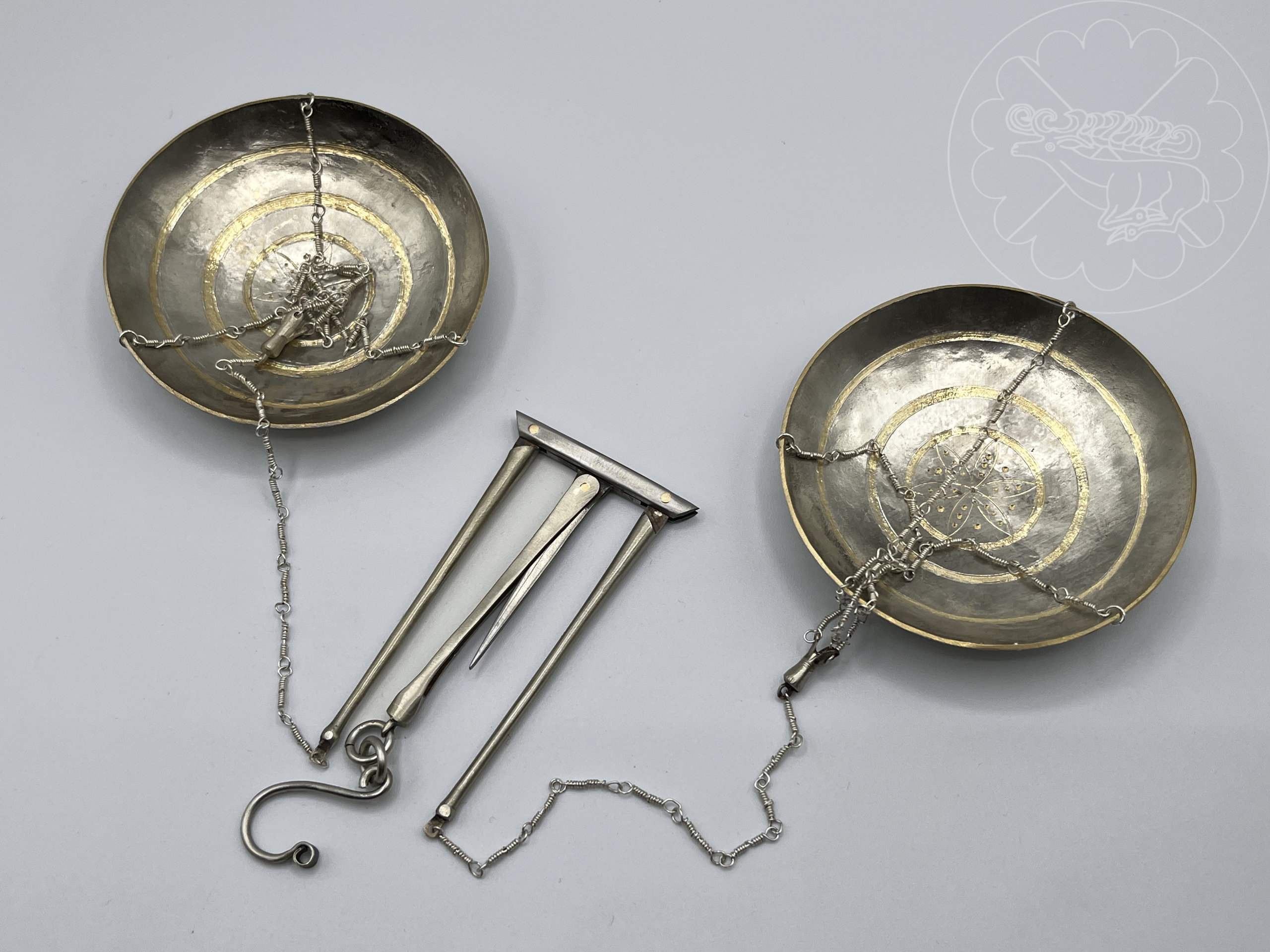 After making my first set of scales and researching various different extant samples, I became interested in making a set inspired by a particular style which featured a silver finish with exposed gold color in the pans. The first example of the style I ran into was this set found near Trondheim.