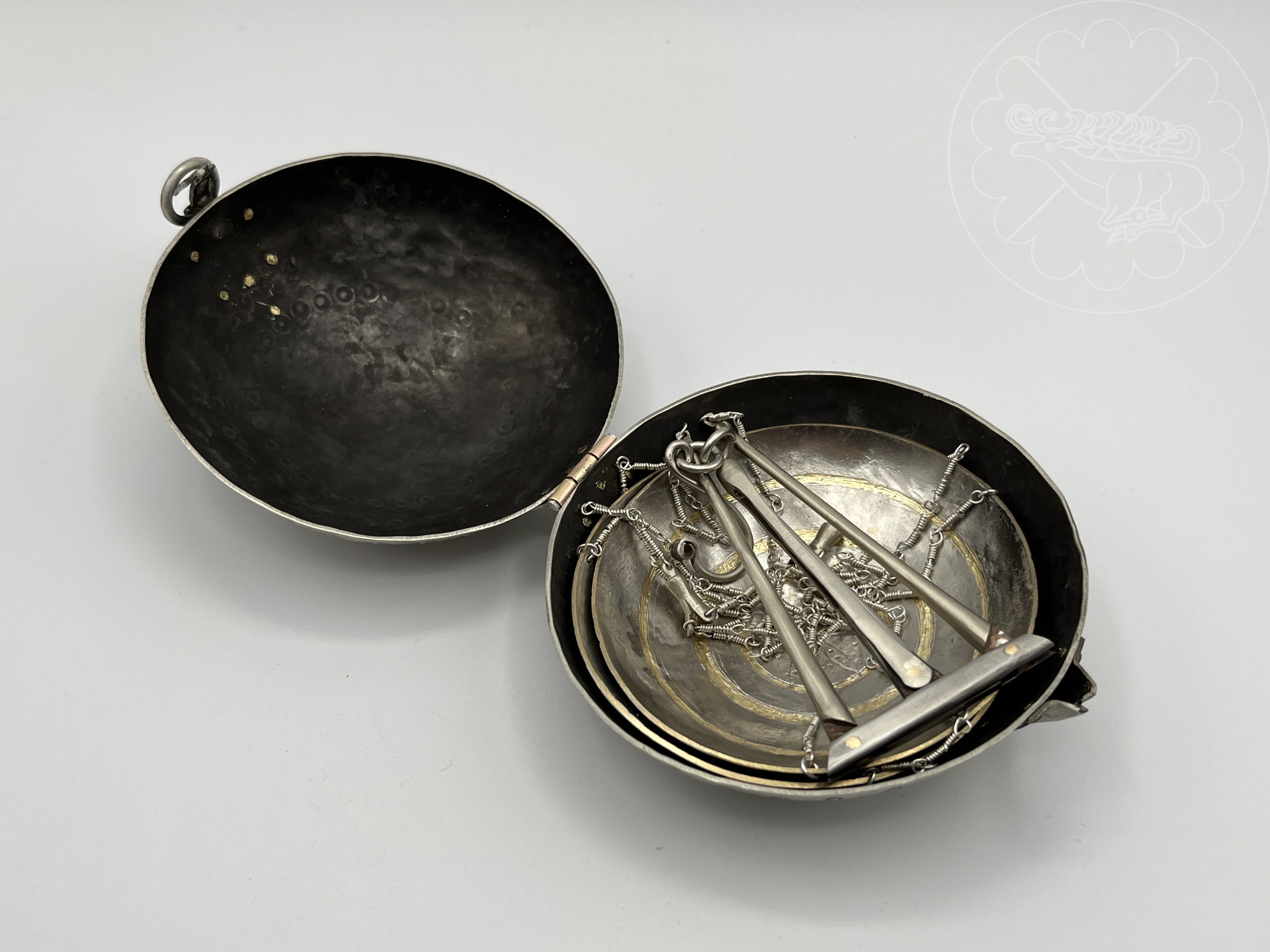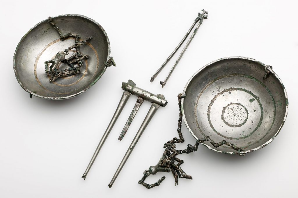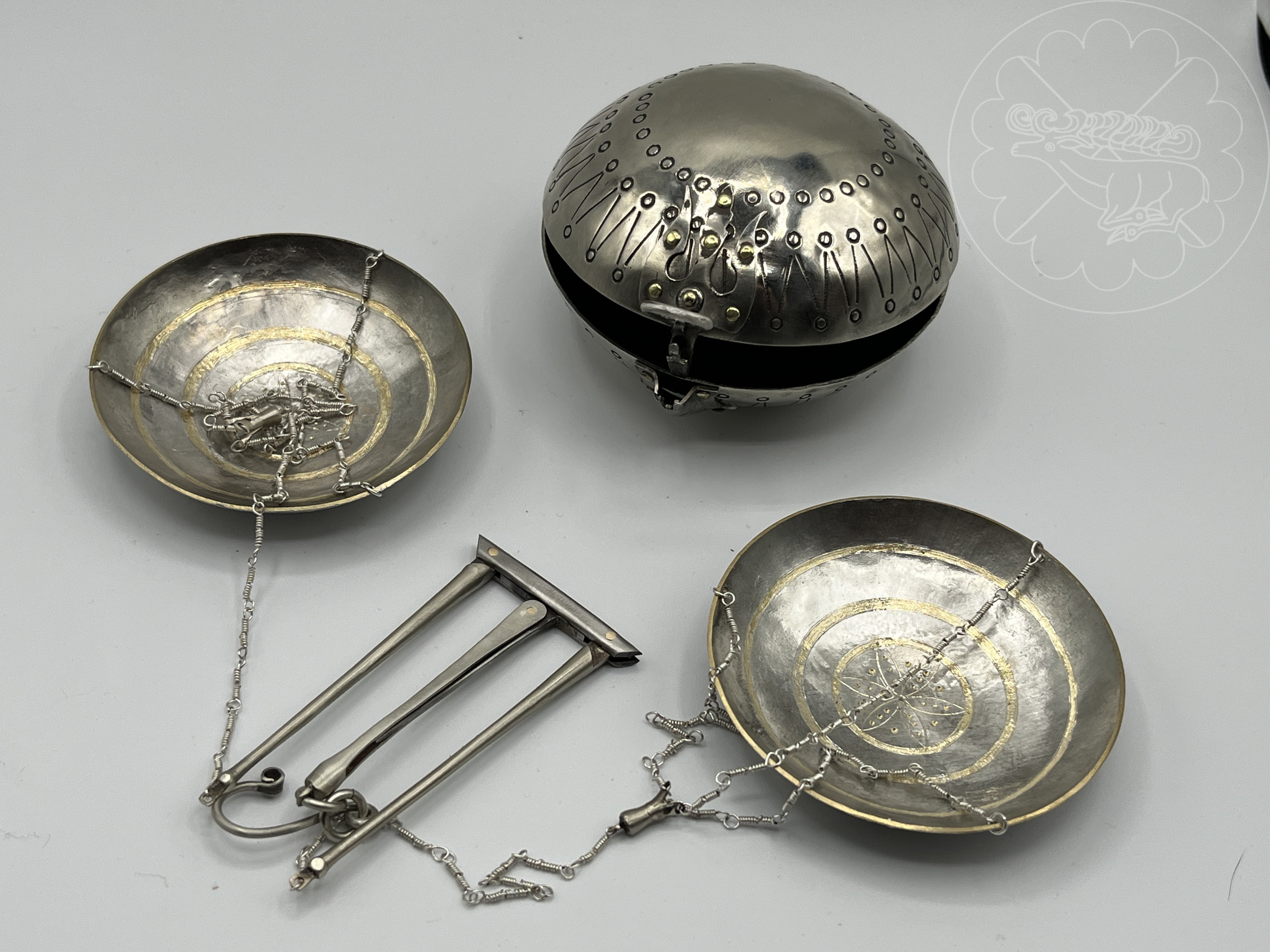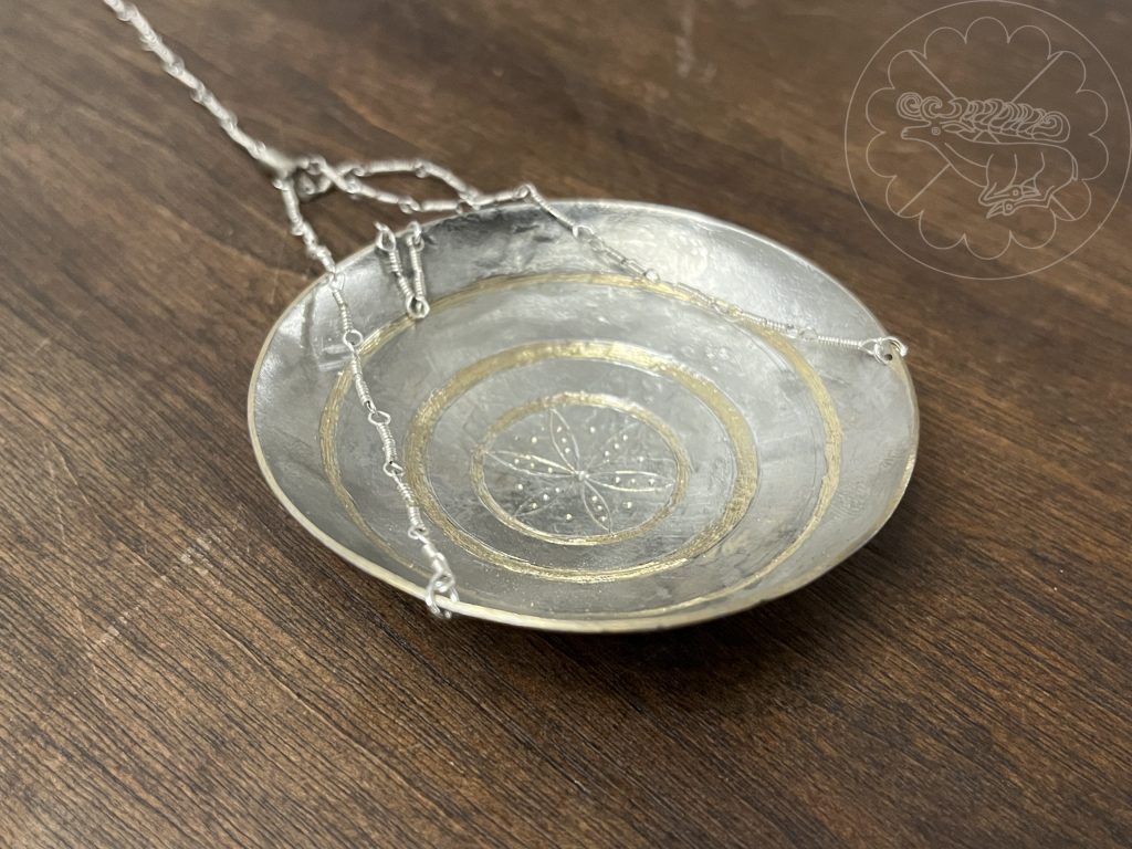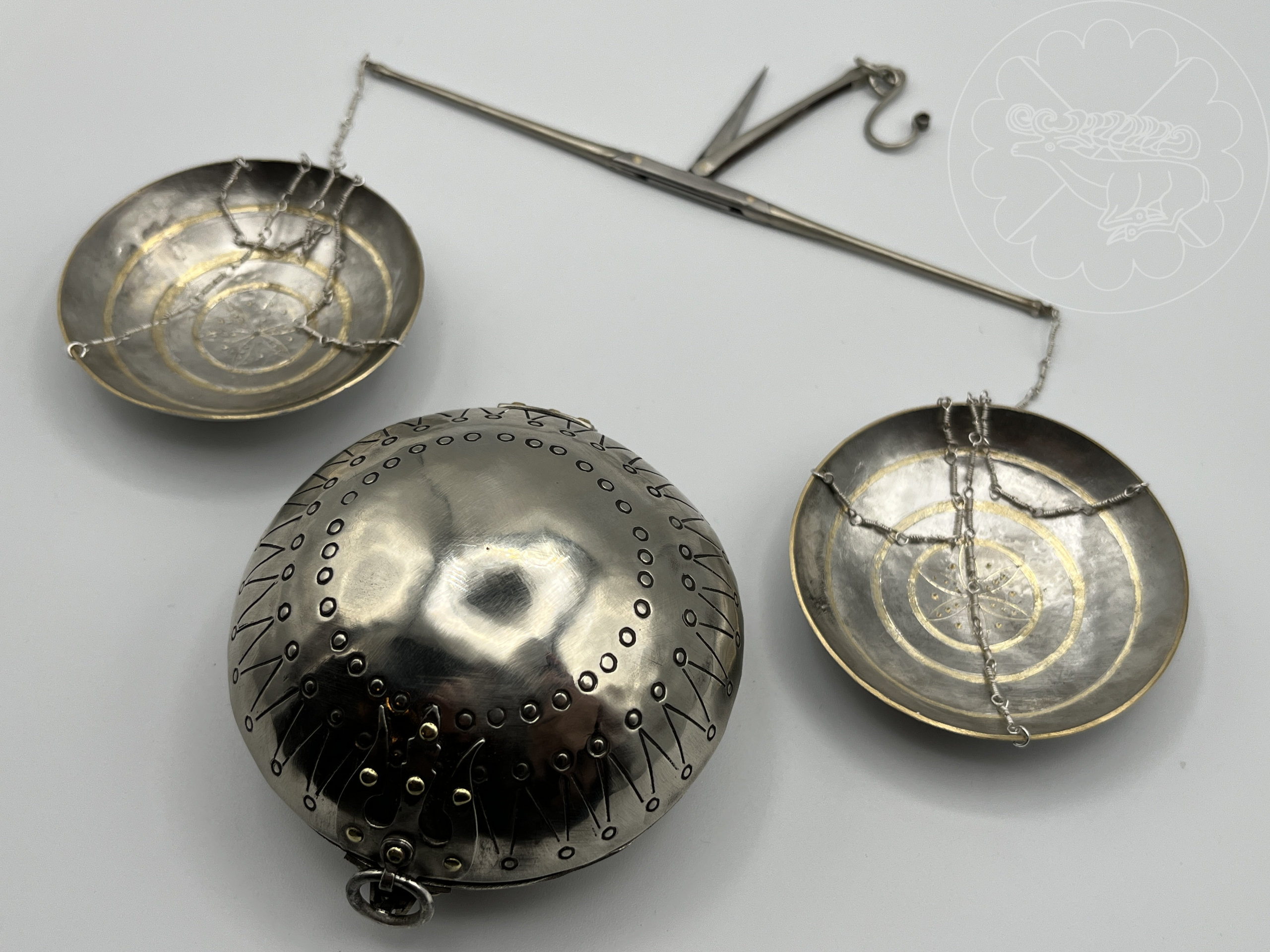After making my first set of scales and researching various different extant samples, I became interested in making a set inspired by a particular style which featured a silver finish with exposed gold color in the pans. The first example of the style I ran into was this set found near Trondheim.