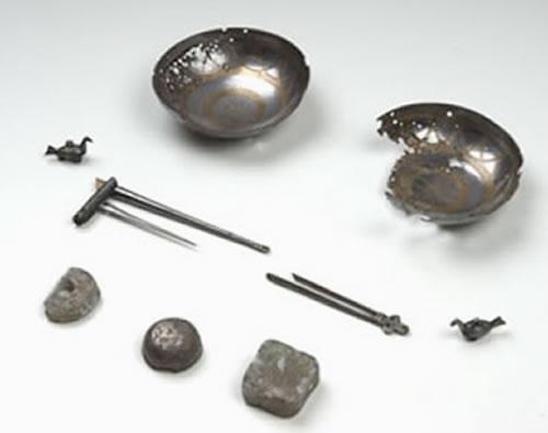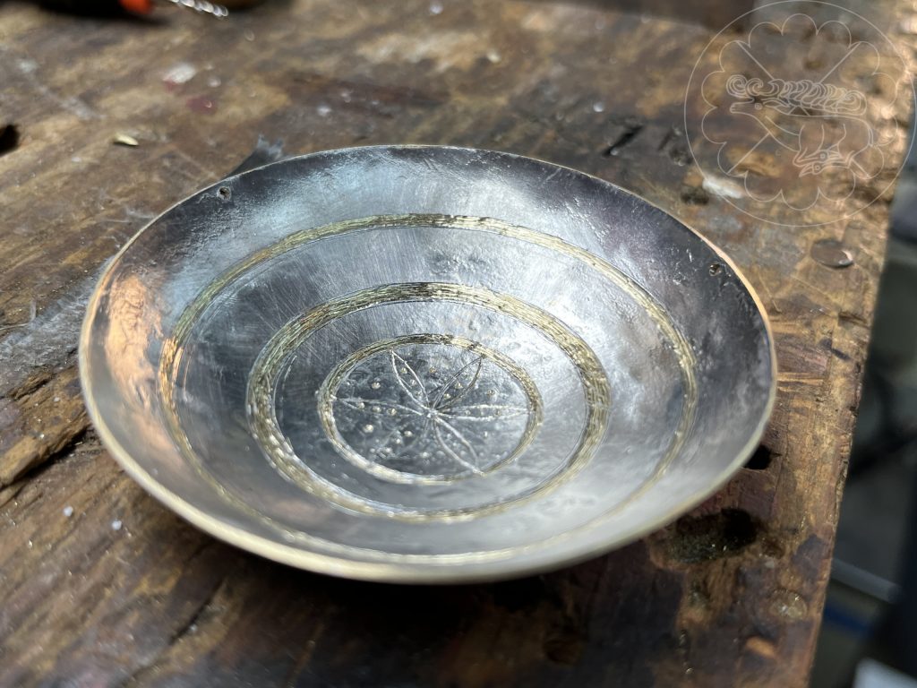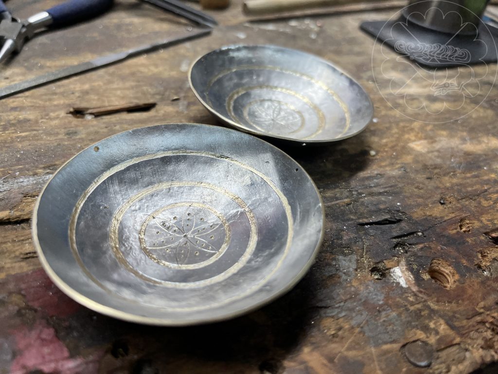 Looking at the bowls, it seemed to me that they were bronze that was somehow coated or plated and then scratched off to expose the material below. The discoloration of the alloy on the edges of the bowl and in some of the exposed area, as well as the fact that the gold colored areas look to be scribed into the bowls pointed to the fact that the bowls were a base metal, rather than gilding on silver, for example. My assumption was that the bowls were coated in tin and then scribed or scratched away to give the two-tone effect. Looking further I found that indeed the scales below, found at Lø, Steinkjer, and were a tin plated copper alloy (Pettersen, A. M. H. (2014). Insular artefacts from Viking-Age burials from mid-Norway. A review of contact between Trøndelag and Britain and Ireland.).