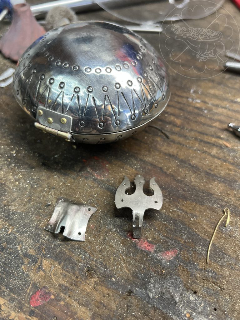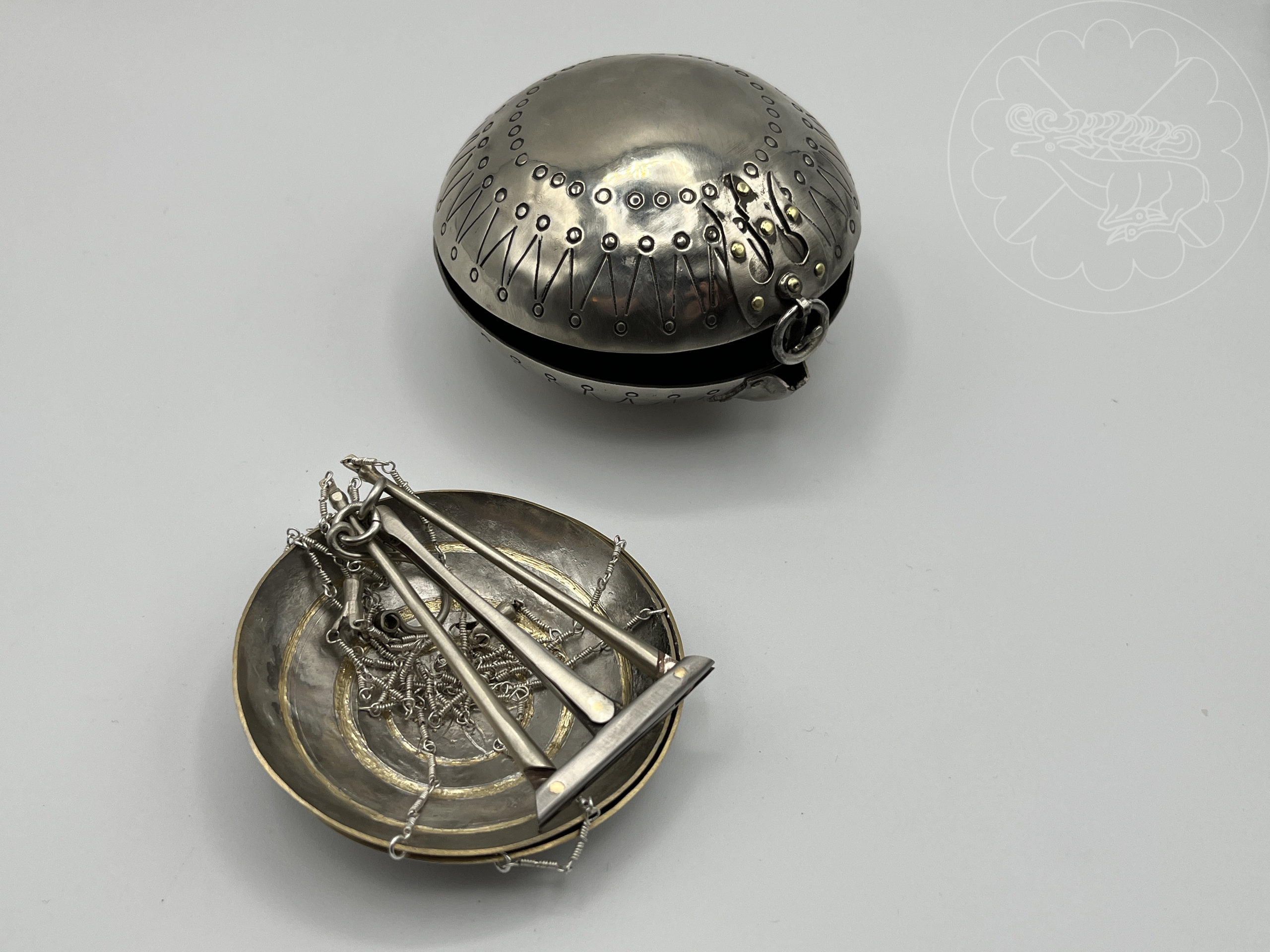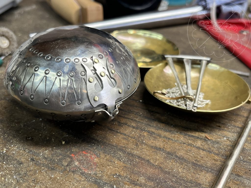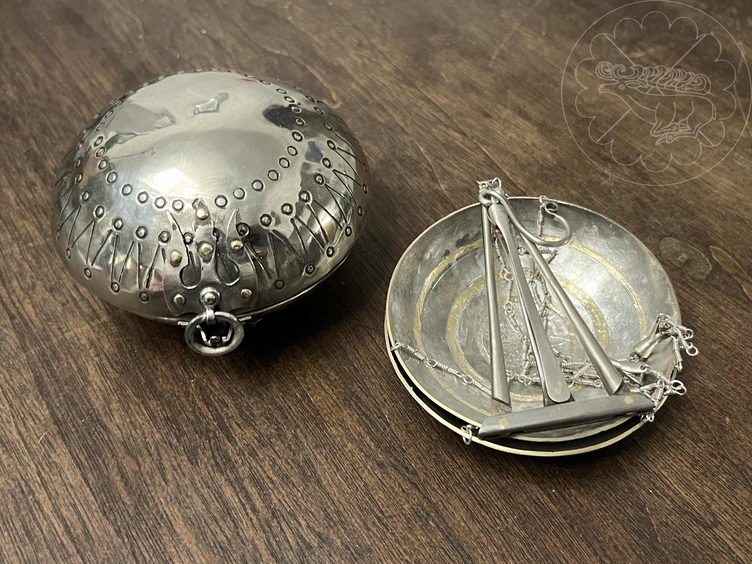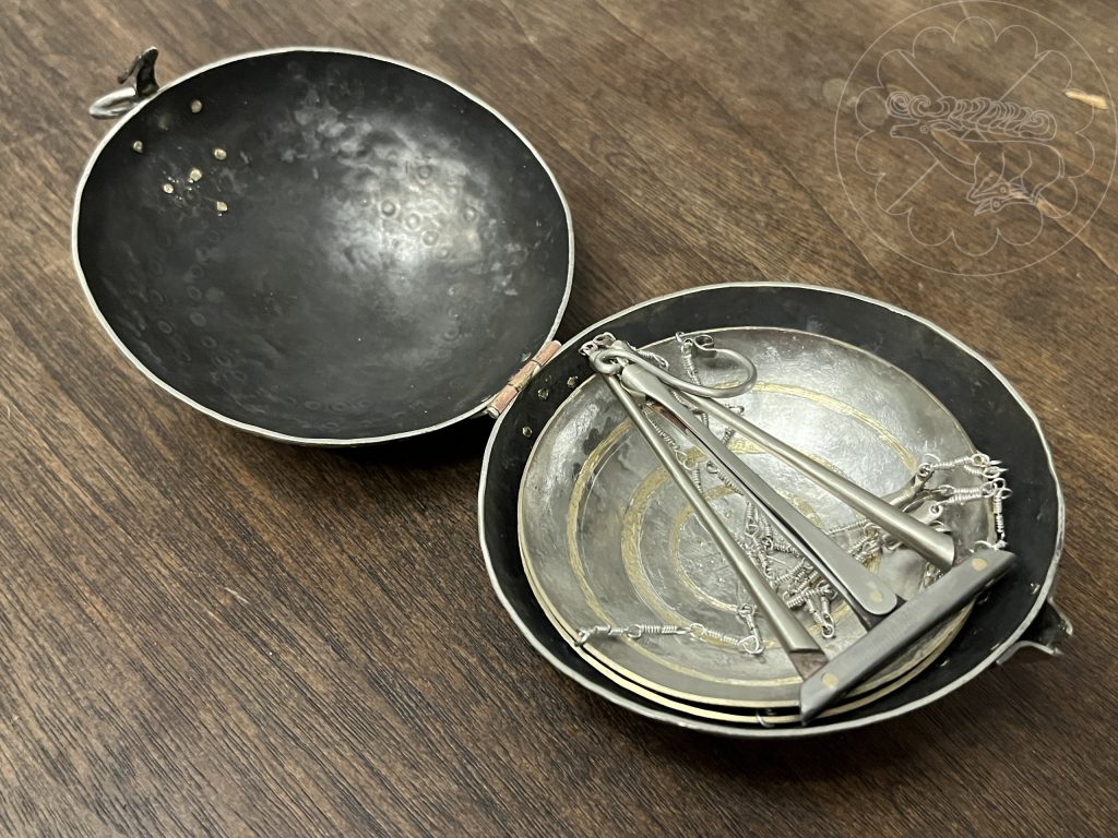 Although none of the extant scales had cases associated with them that I found, I did want to make one to protect them and allow them to be carried easily. The case I made is also from nickel silver with some details, particularly the clasp, inspired by this case found in Gotland.