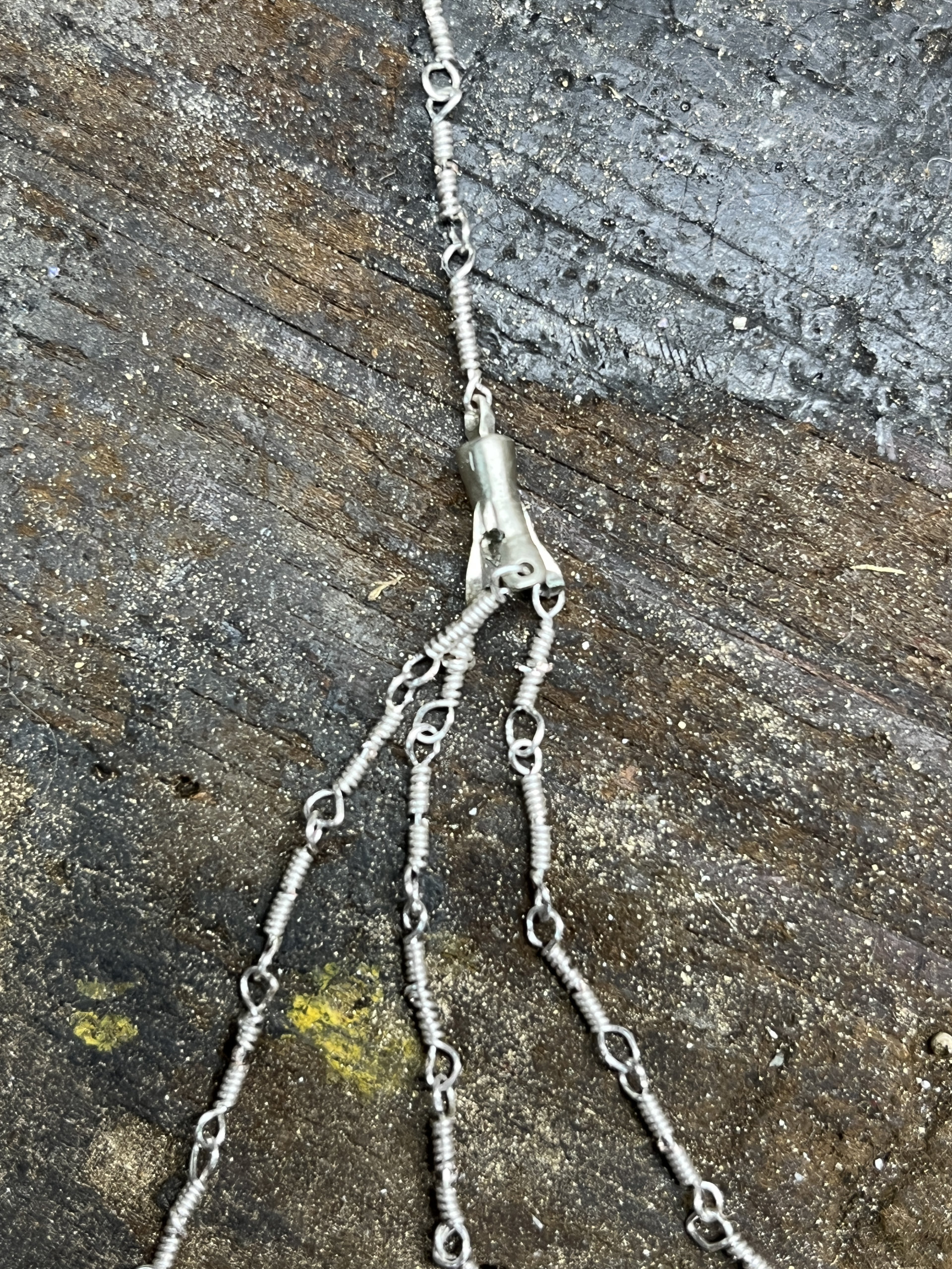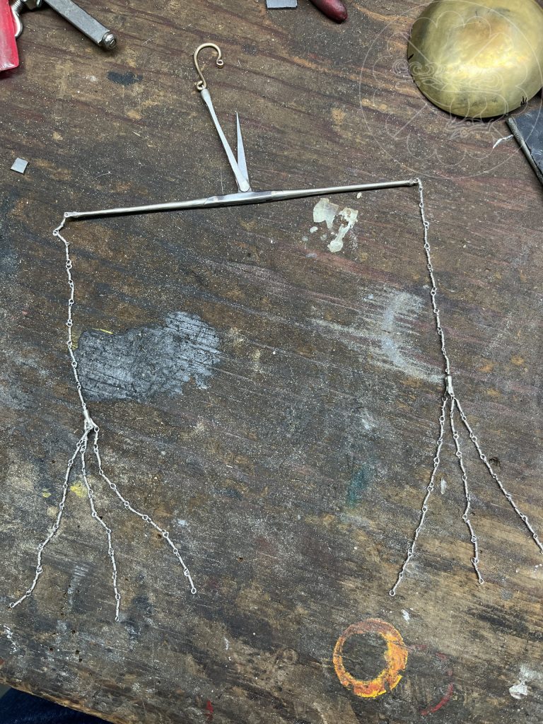 The body of the balance and the chain dividers are fabricated from nickel silver, and the pans tinned brass. The chain is made from 26 gauge tinned copper wire.
