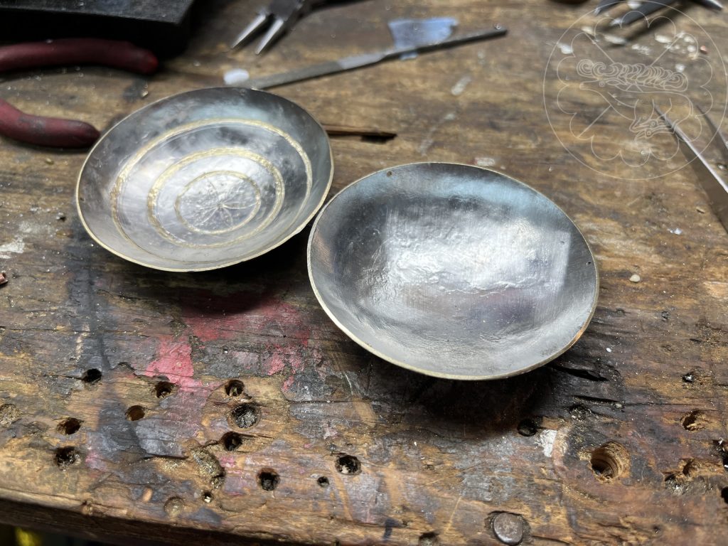 With all of this in mind I then needed to learn how to plate the bowls with tin. Historically, tin was used to coat base metals for both purely aesthetic reasons (to give the appearance of silver) and also to give a protective coating to cookware that may be exposed to acidic solutions that can form copper carbonate which is poisonous. There are a number of way tin was deposited onto other metals, but simplest is to heat the metal and then wipe the tin onto the metal where it melts and coats the surface. Tin has a really low melting point (~450°F or 232°C) compared to copper alloys, so the bowls can be heated easily to tin’s melting point without any danger of melting the bowls themselves. The process uses sal ammoniac powder (ammonium chloride/nausadar) as a flux during the coating process. The brass is heated, the sal ammoniac powder is added, and the tin is then rubbed on the surface to melt, and then spread over the surface with a cotton cloth. I wish I had spent a little more time practicing before jumping in to the scale’s bowls because the initial results on the insides of the bowls are not as uniform as the bottoms which I did later, but overall the results achieved what I was shooting for.